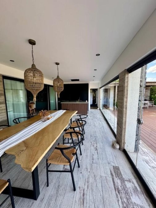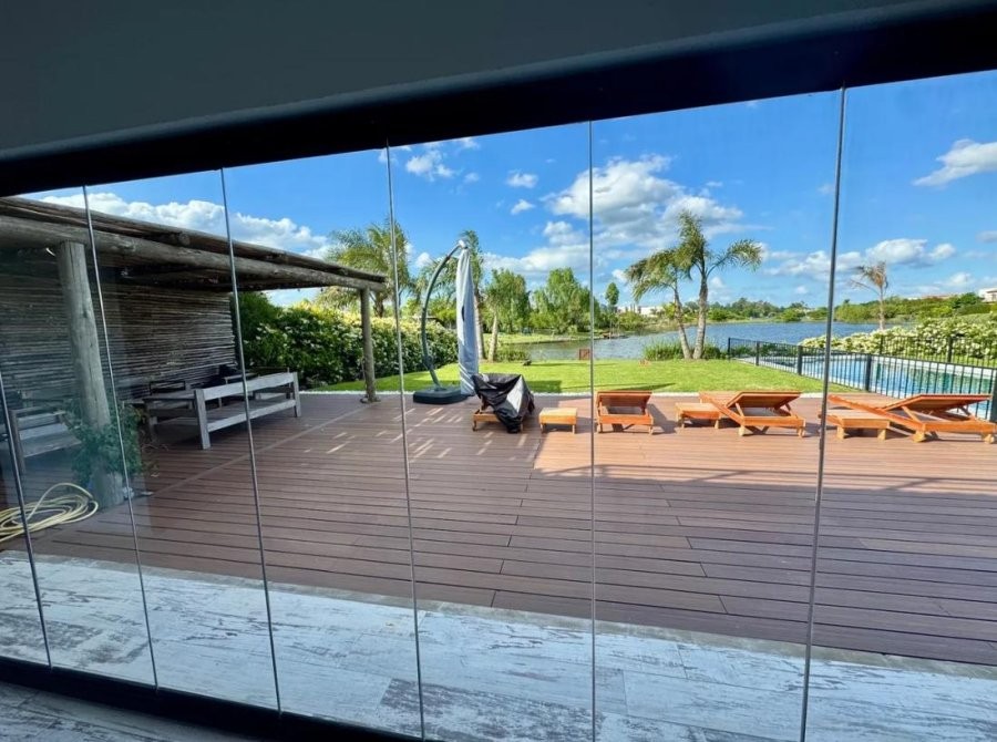 Amplia galería con cerramientos apilables, parrilla doble (gas y carbón), deck en WPC y pileta climatizada de 14 x 5 m revestida en piedra Bali.
