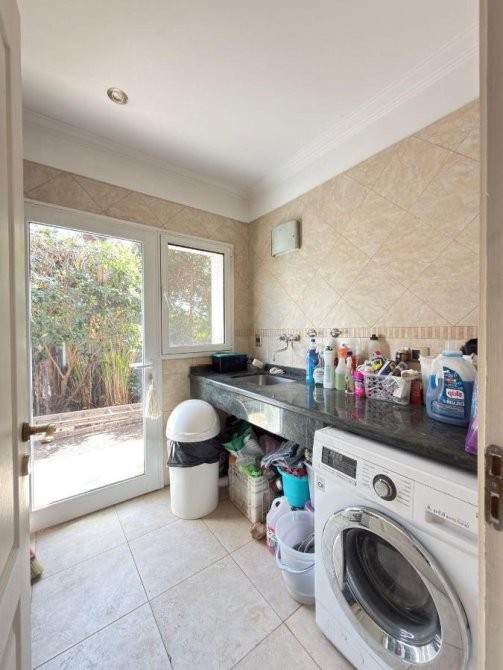 La planta se completa con lavadero independiente, dependencia de servicio con baño, y garage cubierto para dos autos, además de espacio exterior adicional para estacionar.