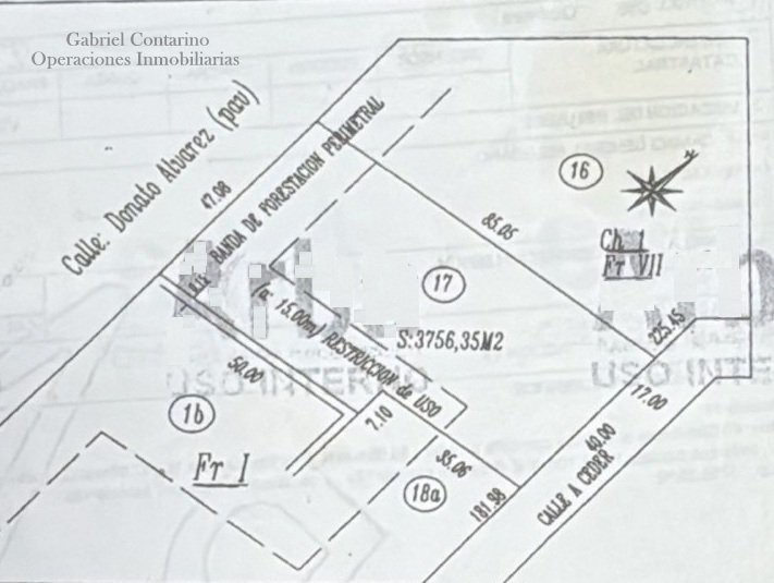 Medidas: Frente 40 metros, 85,05 costado al norte, contrafrente: 47,08 metros, 50 metros lateral lindando al sur, se angosta 7,10 metros al este y 35,06 lateral hacia el frente. Restricción de uso de 15 metros de ancho para forestación de protección ambiental.