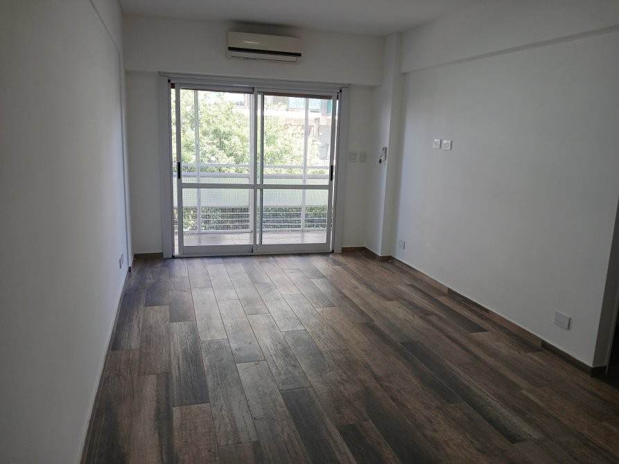 Living de 5 x 3 con piso cerámico simil madera, con ventana balcón en DVH y persiana de madera automatizada.