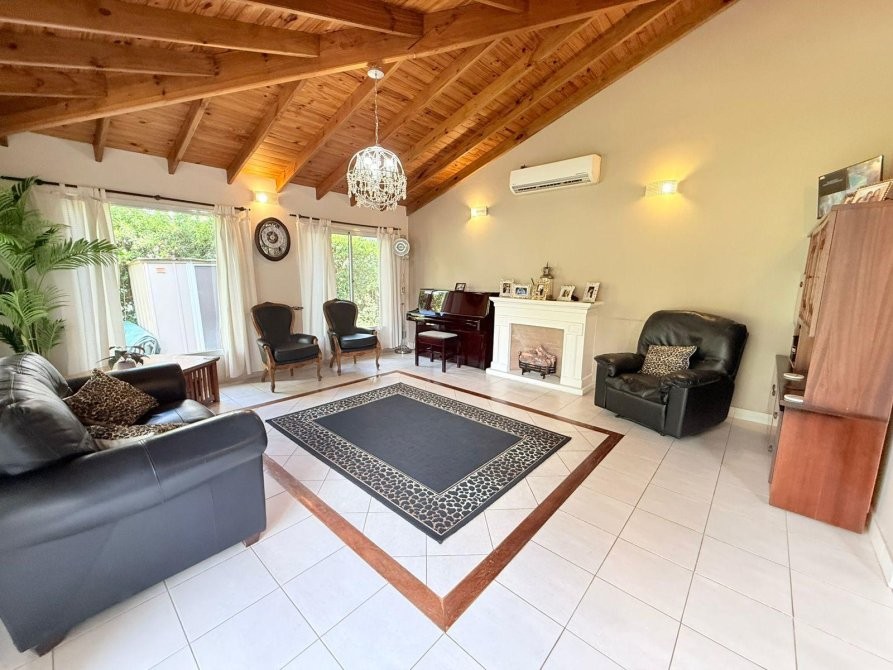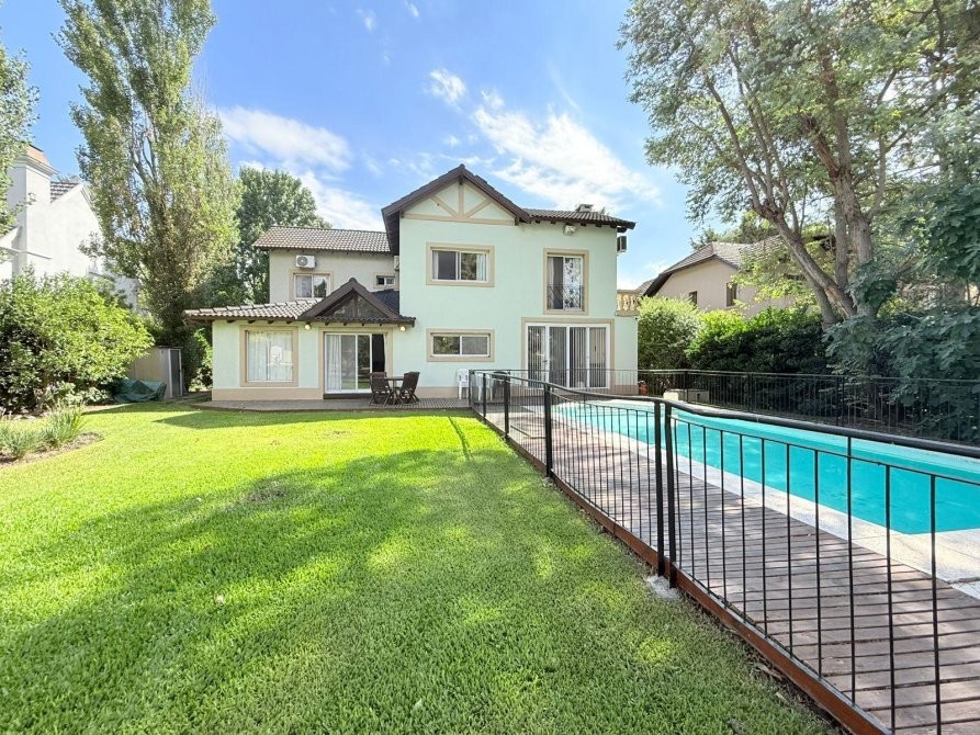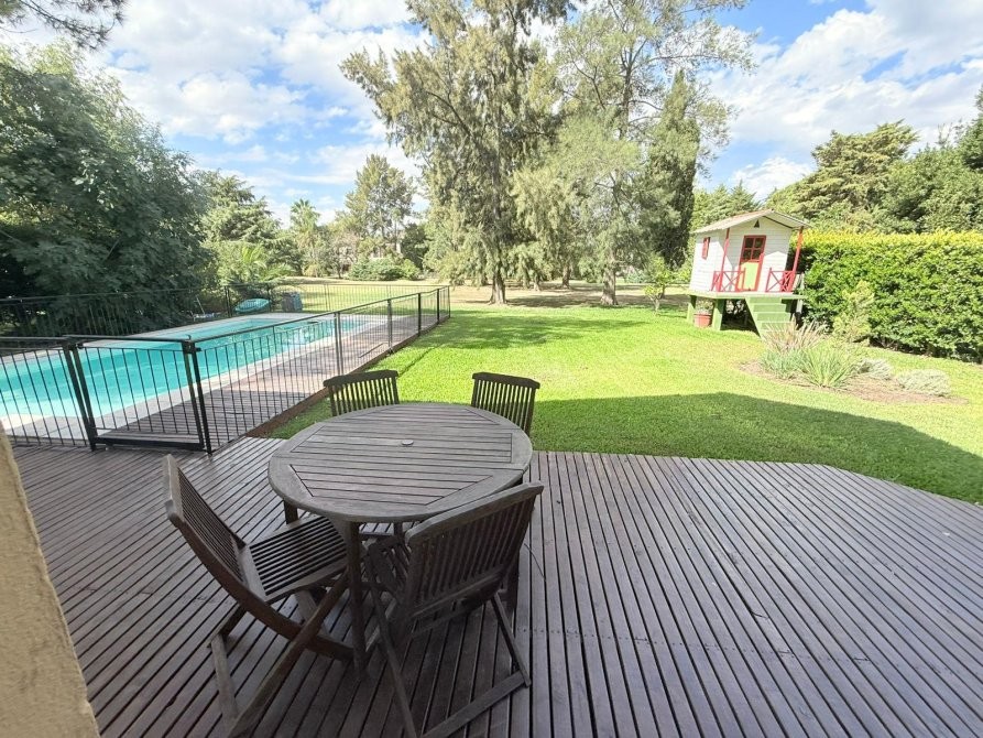 En el exterior, la casa ofrece un gran parque parquizado con riego automático, generador a gas, salida directa al golf, deck de madera y una piscina climatizada que permite su uso durante gran parte del año, creando un entorno ideal para el relax y el disfrute.