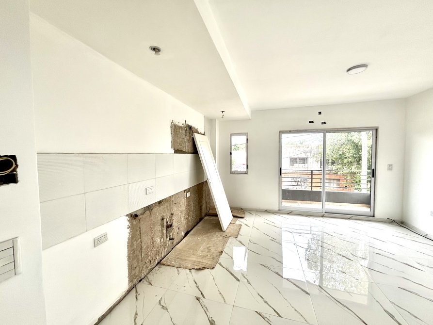 Al ingresar, se accede a un amplio living comedor con cocina integrada, equipada con muebles bajo mesada y alacenas colgantes. El ambiente principal cuenta con puerta balcón con salida al frente, lo que aporta muy buena luz natural.