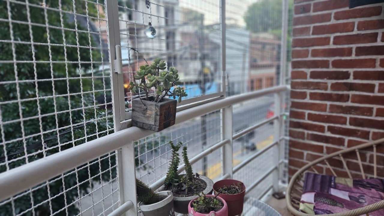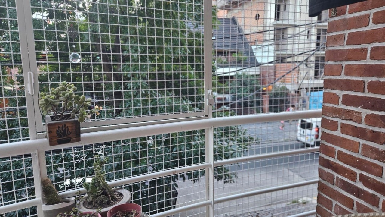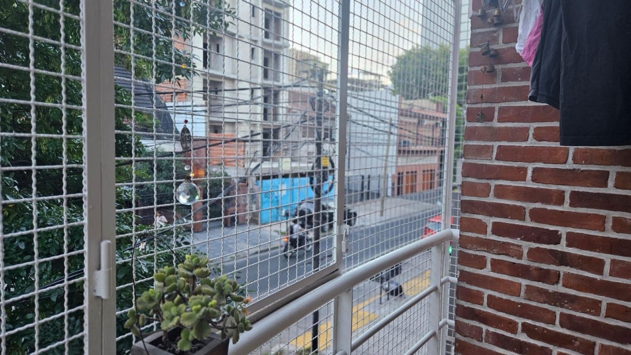 Con balcón, terraza compartida con parilla mesas y sillas.