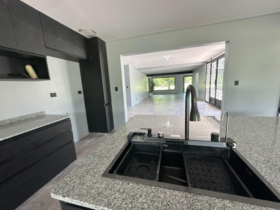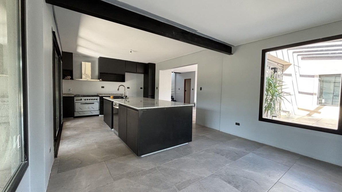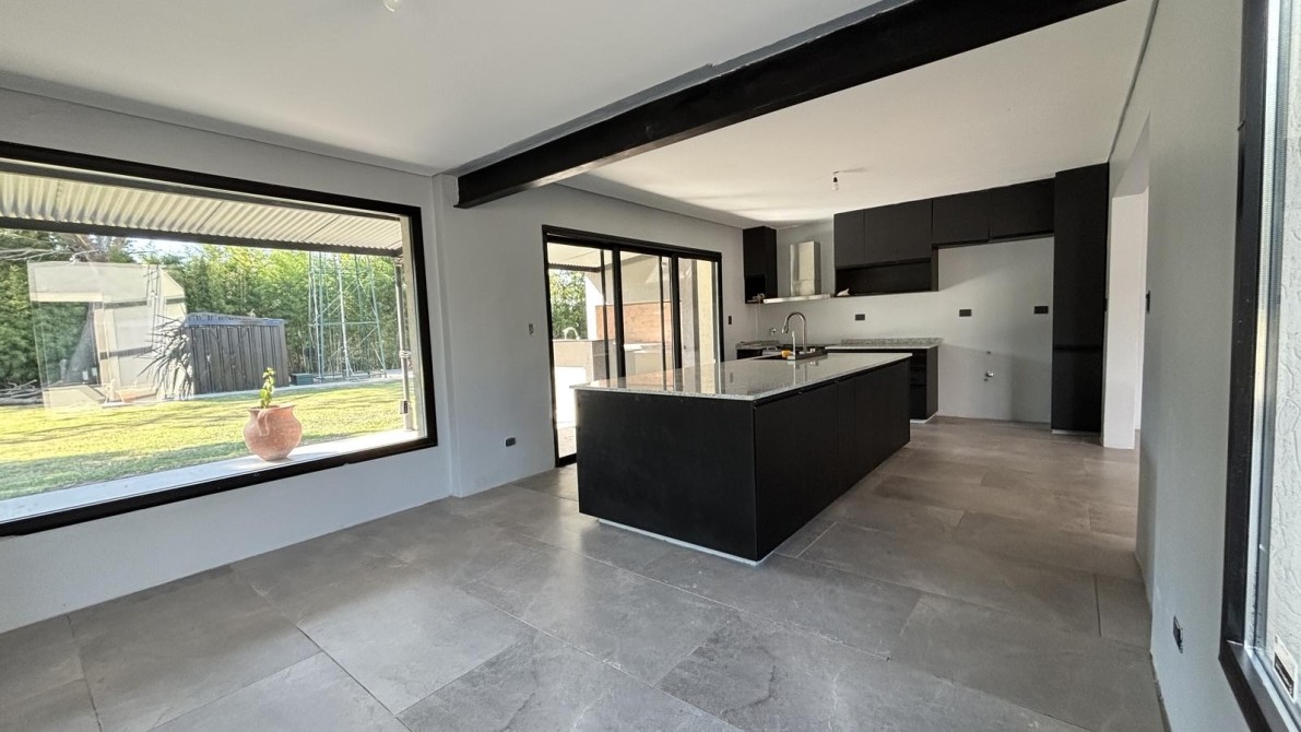 Cocina de generosas dimensiones con isla conectada a la zona de parrilla. Equipada con bacha inteligente, lavavajillas, heladera Sidebyside con fabricadora de hielo, amplios espacios de guardado, luminosa y funcional.