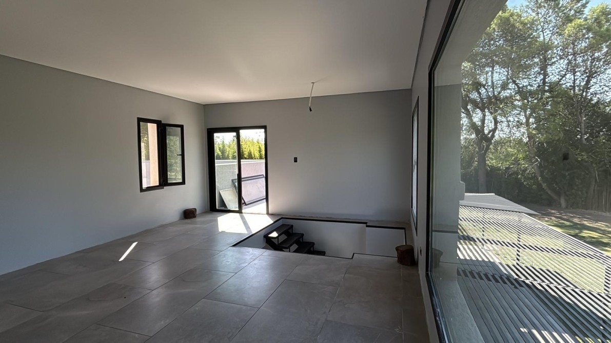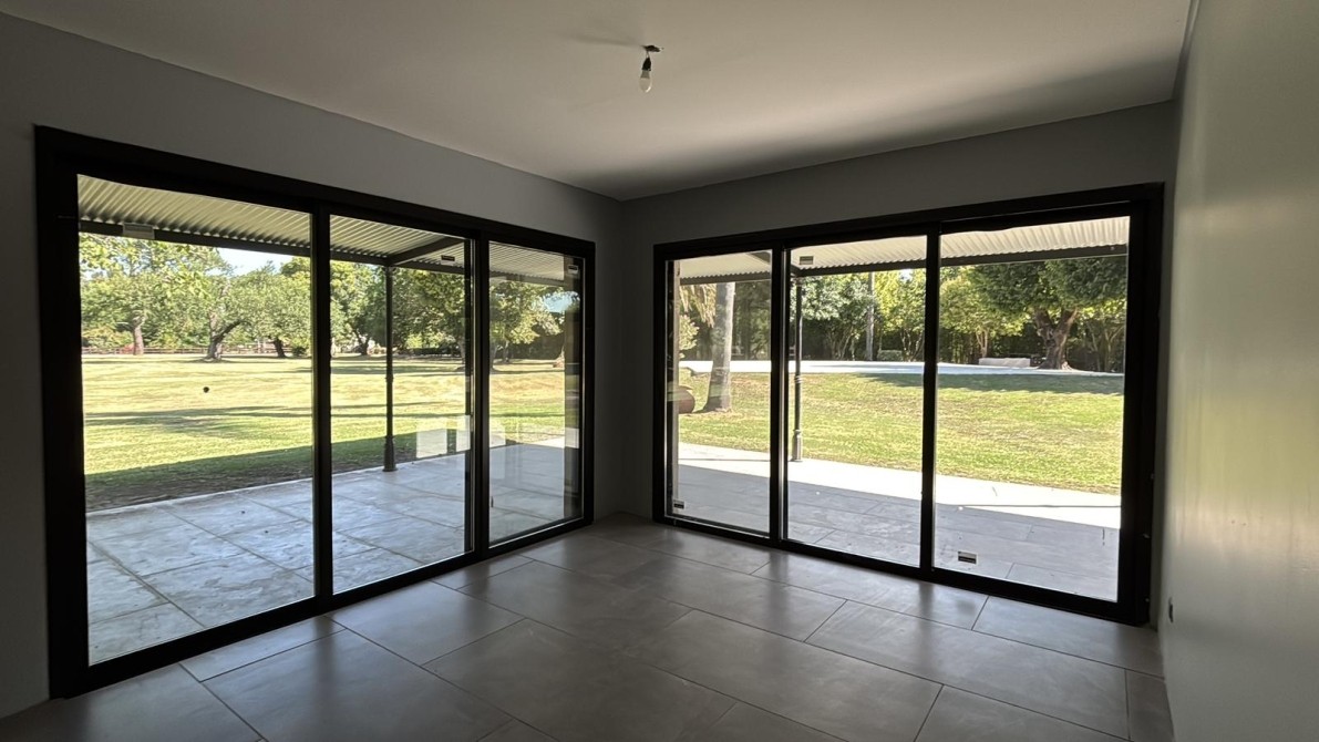 Grandes ventanales en todos los frentes, aberturas DVH premium y porcelanato uniforme interior-exterior.