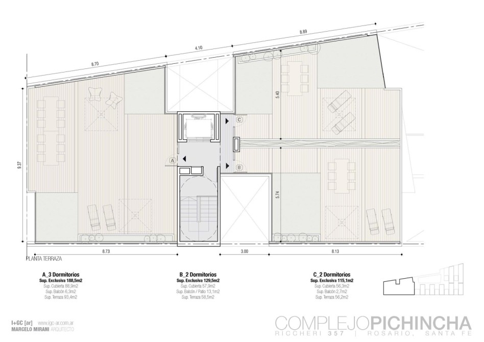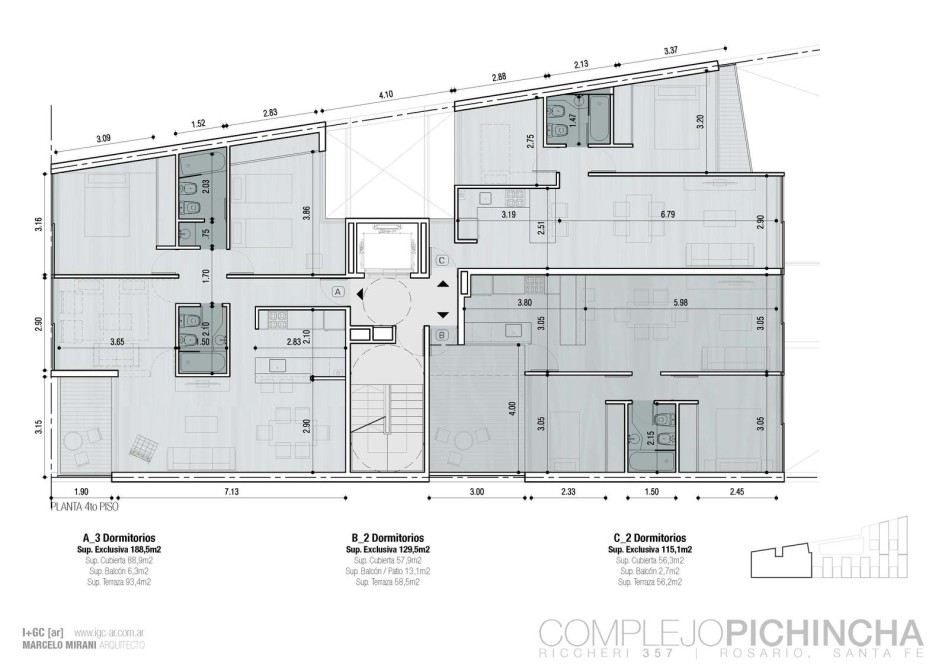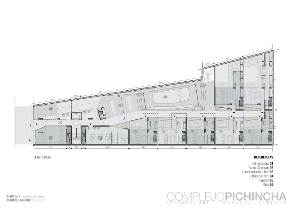 El Complejo Pichincha se desarrolla en planta baja y cuatro pisos, equipado con ascensor y un imponente hall de ingreso de doble altura con previsión para seguridad privada. Ingreso independiente a cocheras mediante tarjetas magnéticas, además de contar con local comercial y oficina en planta baja.
