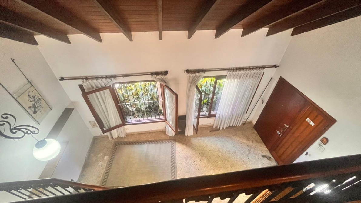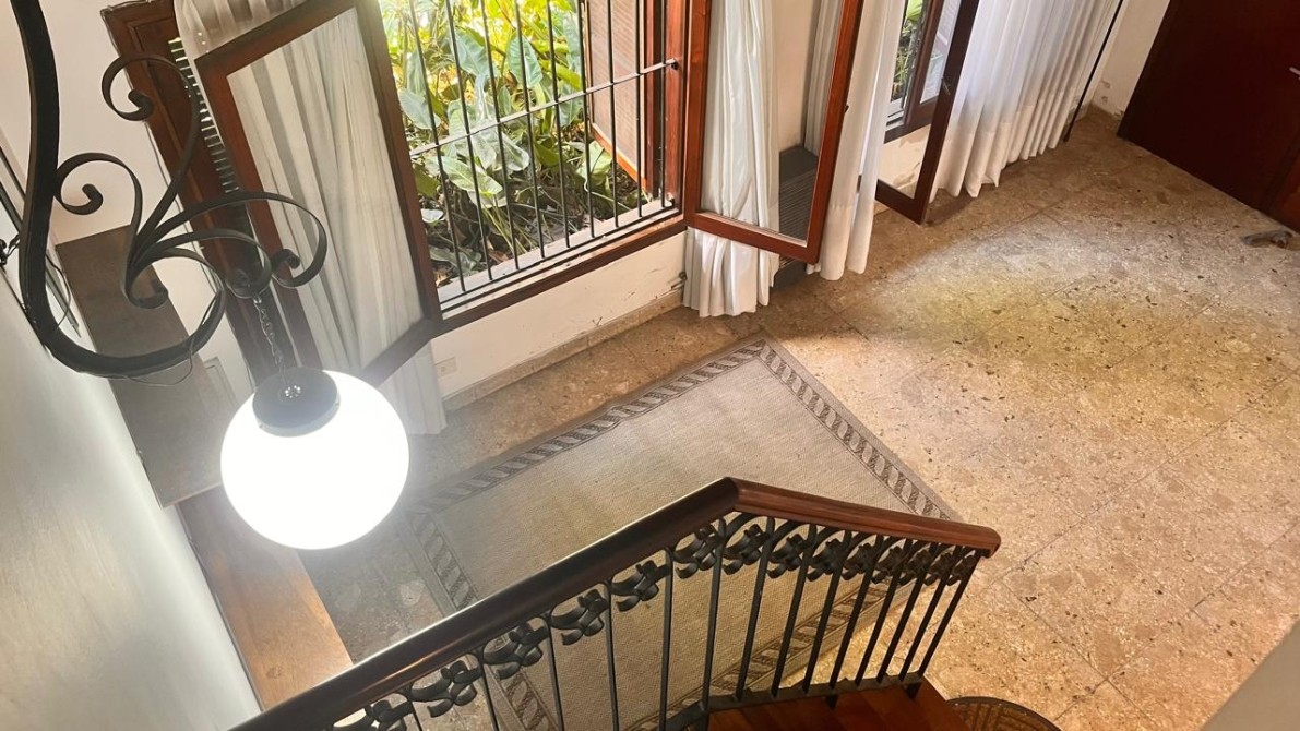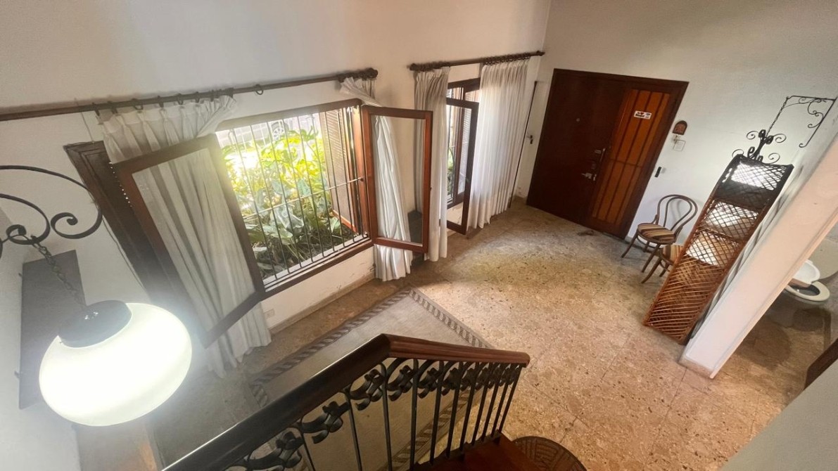 Una escalera de madera conduce a la planta alta, donde un distribuidor con detalles de rejas de estilo balconea hacia el living, aportando personalidad y diseño.