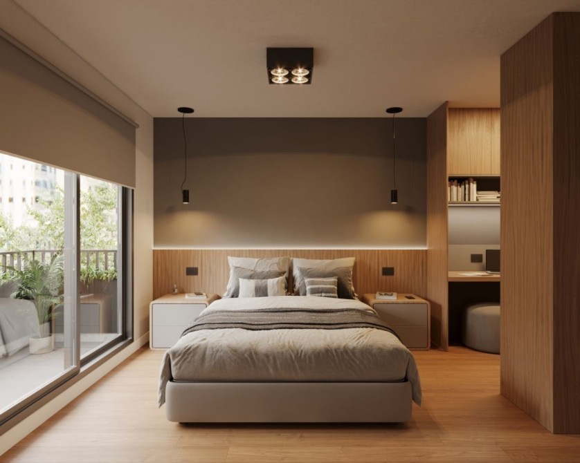 Piso de instalación flotante símil madera en dormitorios para brindar calidez a estos ambientes.
