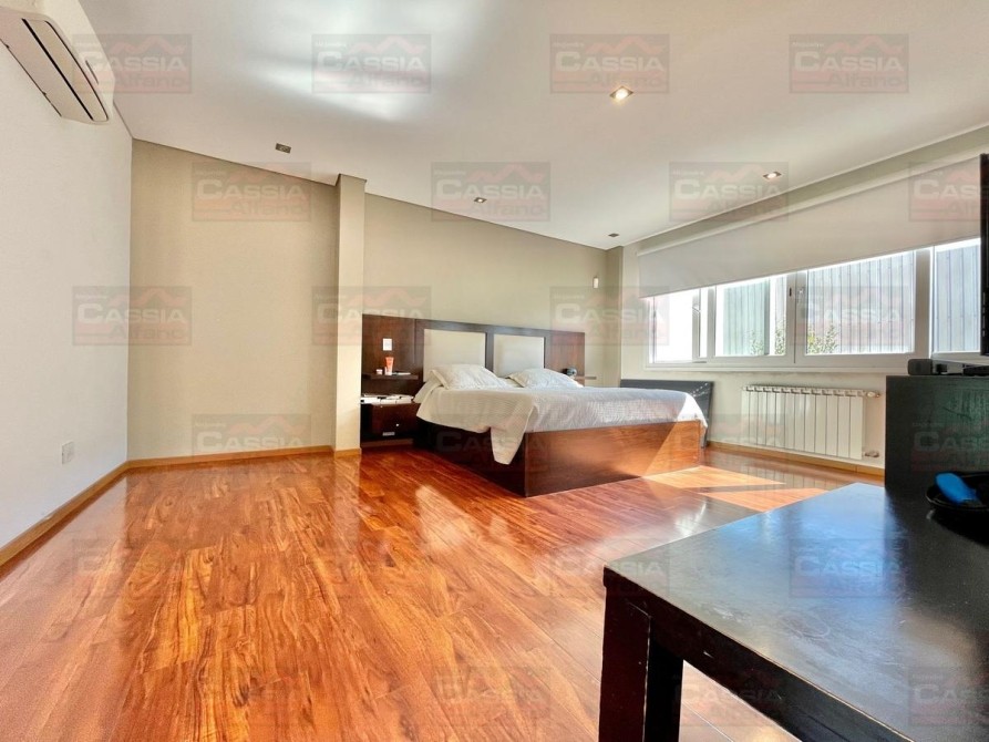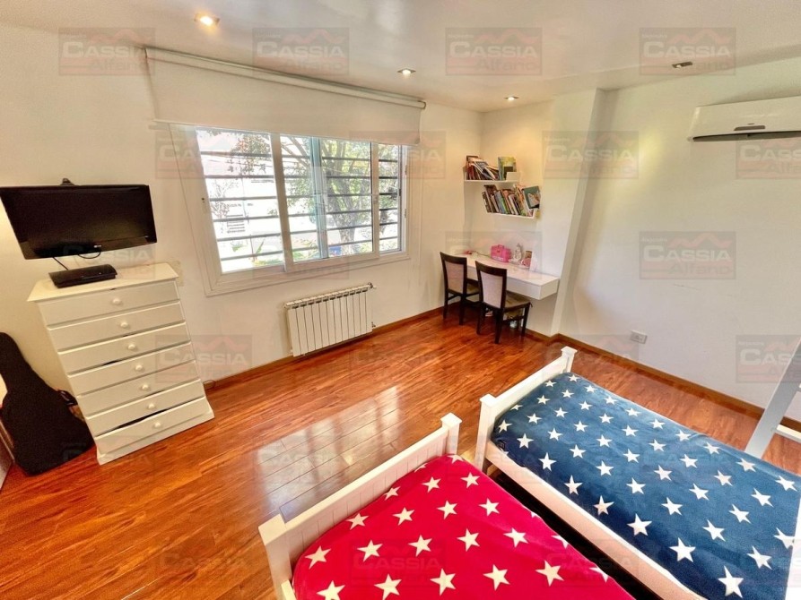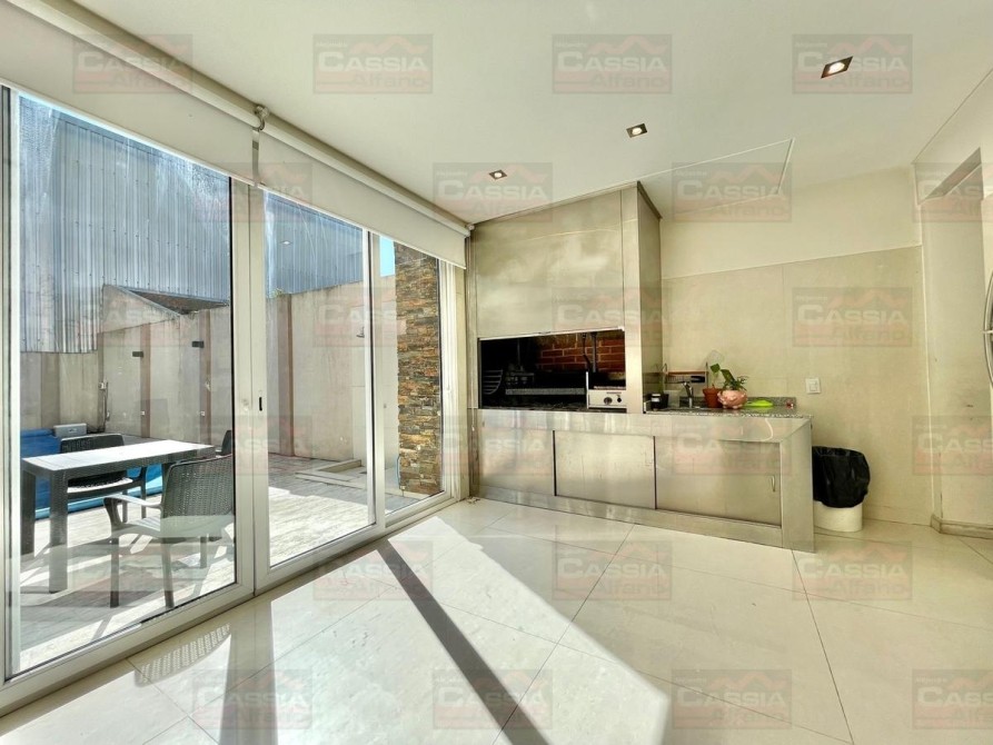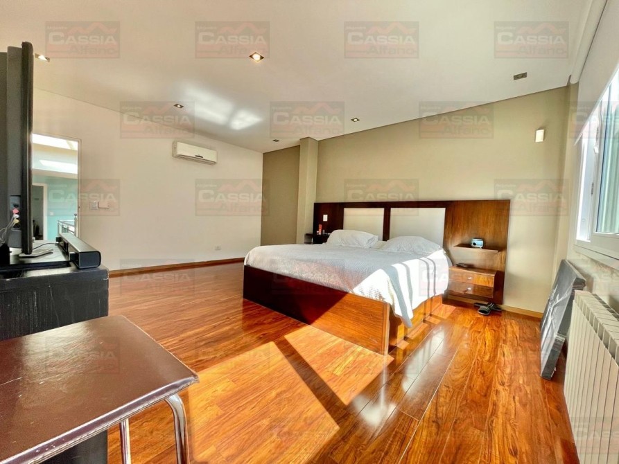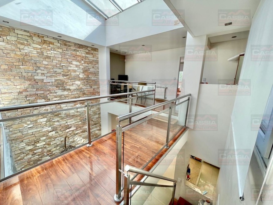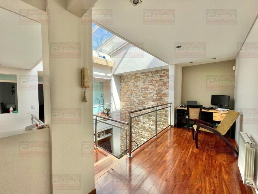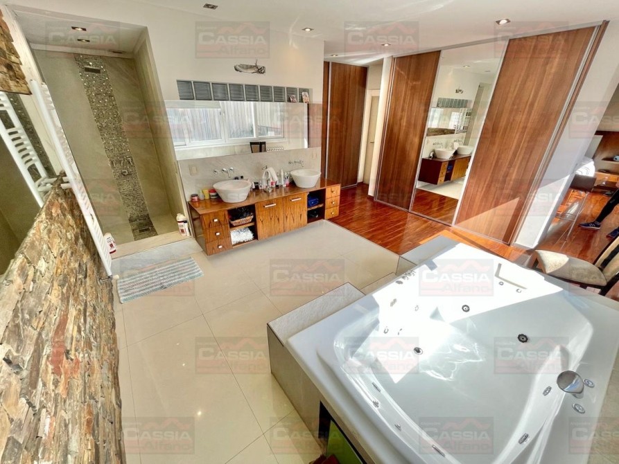 PLANTA BAJA: rejas de seguridad, jardín al frente, garage para 2 vehículos amplios con portón automatizado y espacio de guardado dedicado, Living ial frente integrado a un amplio comedor, CUPULA SOLAR con cuadruple vidrio laminado que proporciona un ambiente central SUPER LUMINOSO, toldo automatizado, cocina totalmente equipada con muebles bajo mesada y alto con alacena, isla central, campana extractora, pisos porcelanato, y madera entablonada de primera calidad. MUY LUMINOSO! Un baño totalmente equipado, Patio central, hall distribuidor, amplio fondo libre parquizado, PISCINA CLIMATIZADA (caldera a gas natural nueva) espejo de agua de 8 x 3,50, revestimiento interno AQUAVATIONS, con Venecitas perimetrales, baldoza atermica, sistema de cobertor automatizado que permite el transito, anti caida, bomba y filtrado automatico. Sistema de Agua Caliente por calderas DUAL ultima generación (UNA PARA PLANTA BAJA Y OTRA PARA LA PLANTA ALTA). Radiadores calefactores en todos los ambientes, SALA de ESTAR tipo QUINCHO integrado en un ambiente único con orientación NORTE con PARRILLA acero inoxidable doble uso CARBÓN/GAS, bacha de lavado, muy buen ingreso de luz, integramente vidriado con cerramientos DVH (doble vidriado hermético) en PVC de primera calidad. Ducha exterior. DETALLES DE CATEGORÍA-