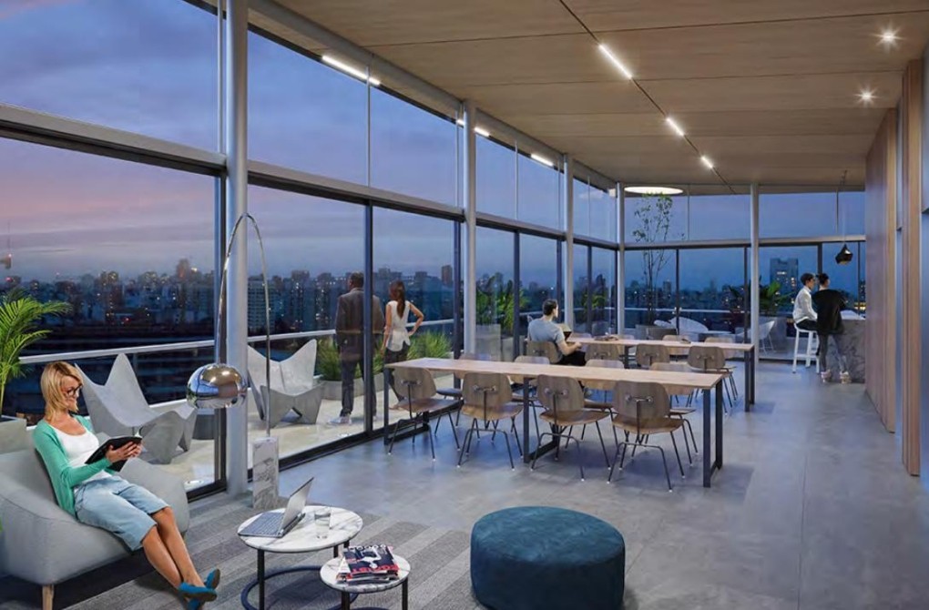 - Sector con livings al estilo coworking con equipamiento moderno y flexible, lugares de Lockers, mesas de reunión, etc.
