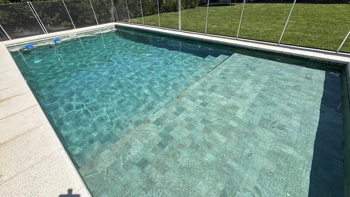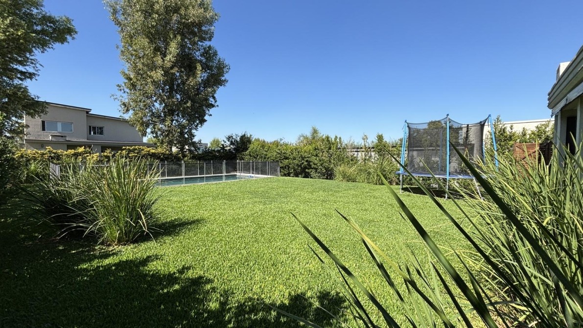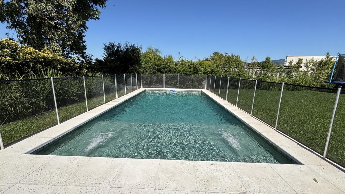 Pileta de calidad Premium con revestimiento en piedra Brazil y con cerco protector para niños, riego automático, jardín parquizado.