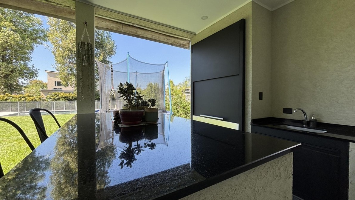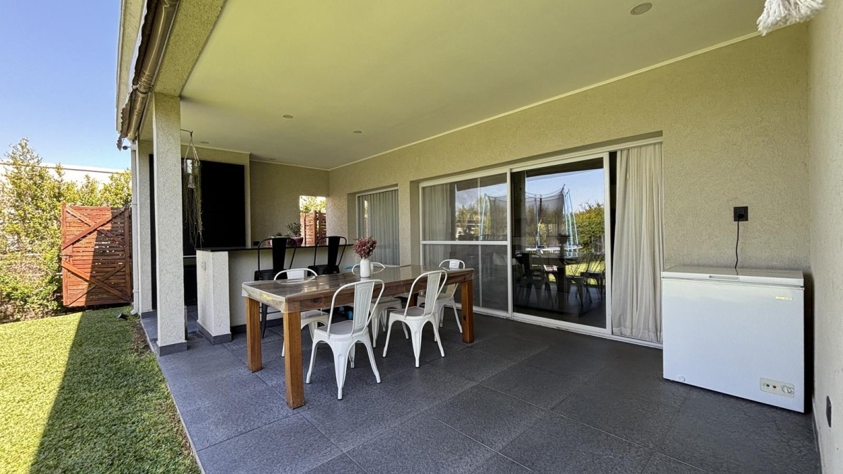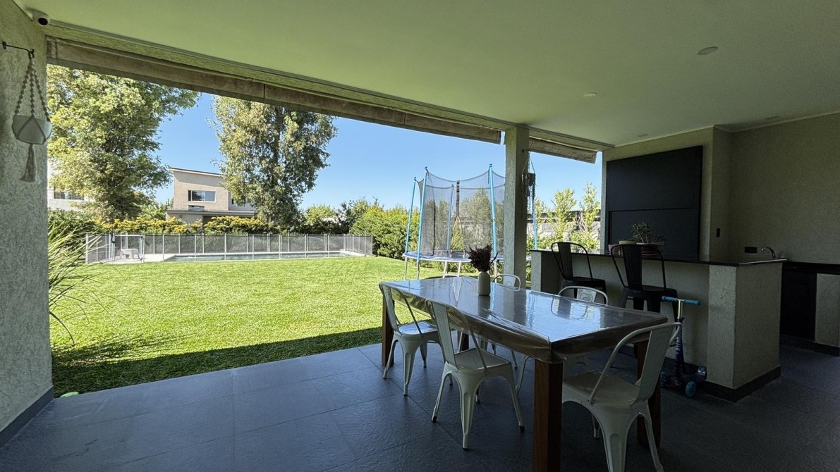 Amplia galería con toldos, sector de parrilla con frente, bacha, mesada e isla, ideal para reuniones sociales.