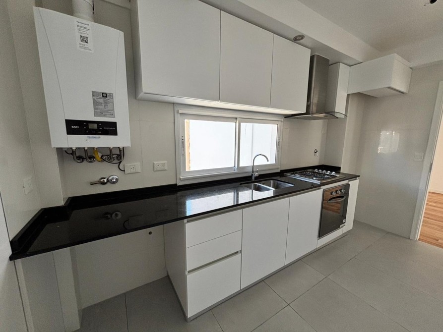 Cocina moderna con mesada de granito negro Brasil, muebles completos