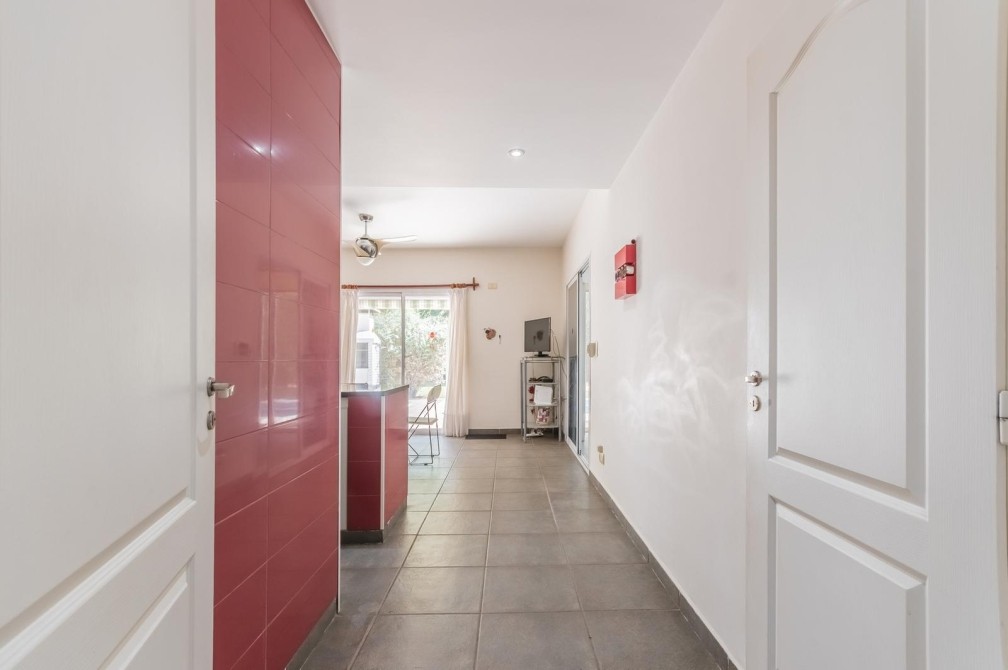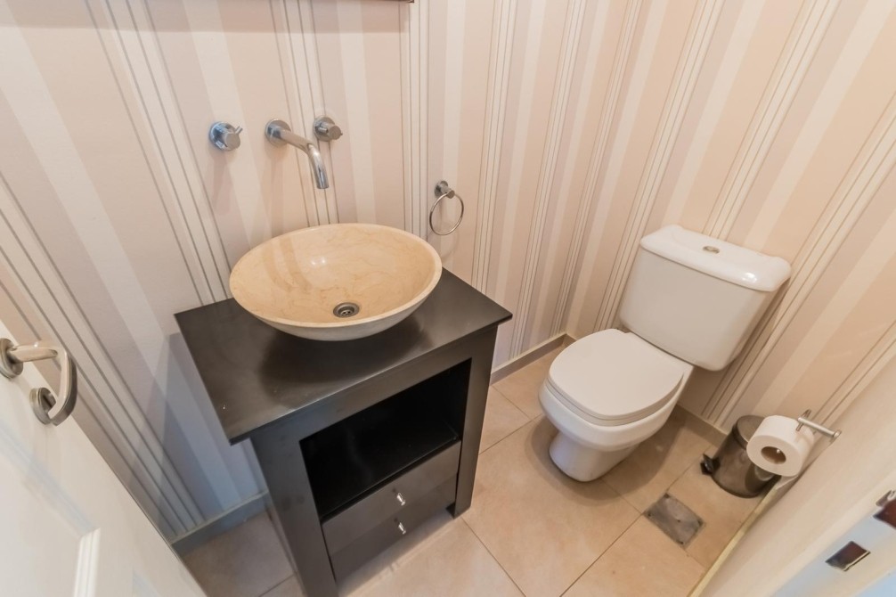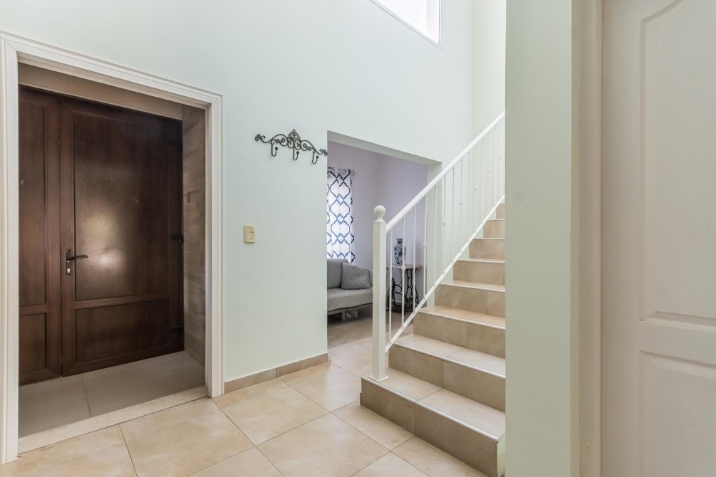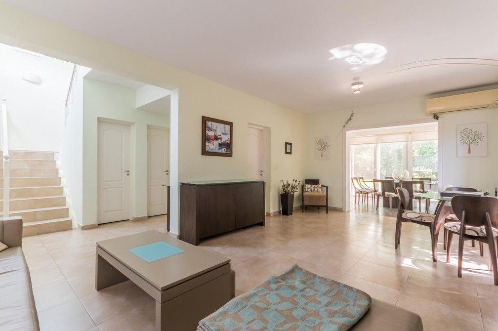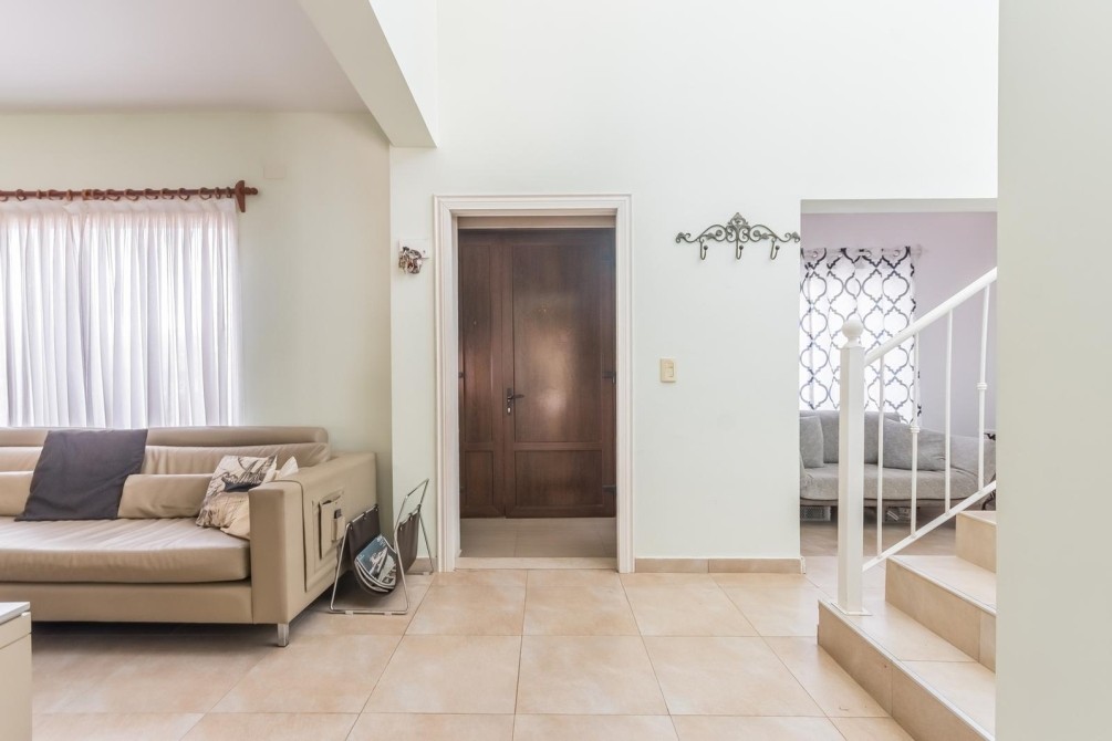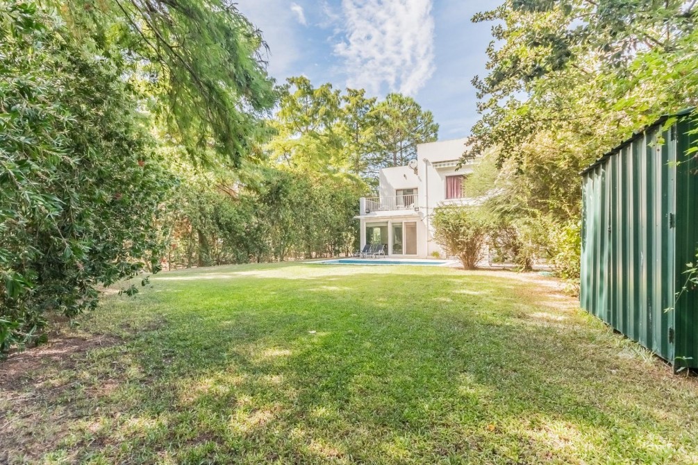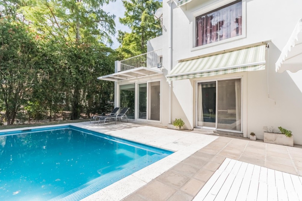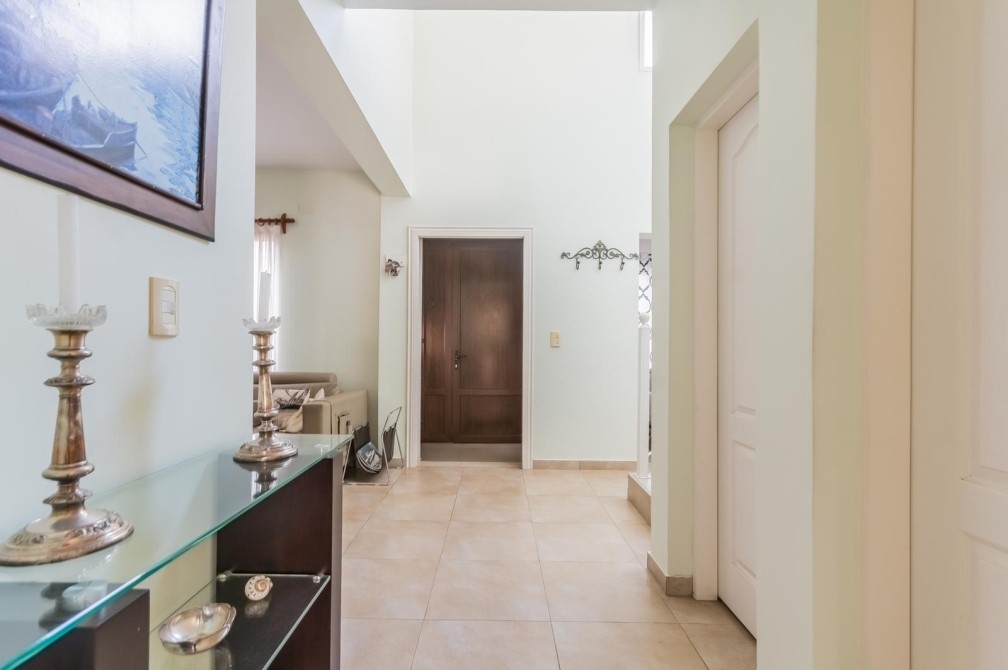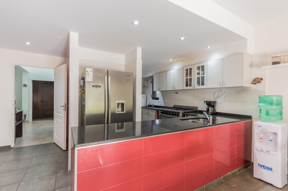 Desarrollada en 2 plantas, al ingresar nos encontramos con un hall de entrada, que nos muestra la cómoda doble circulación de la planta baja, de un lado nos conduce por un gran living, cálido y luminoso, con vistas al jardín y la piscina. Por el otro lado, mediante un pasillo accedemos al toilette y a la amplia cocina, con moderno equipamiento, con grandes mesadas de granito, bajo mesadas y alacenas, donde también se encuentra el comedor diario.