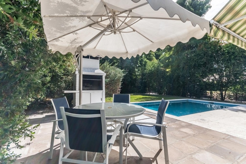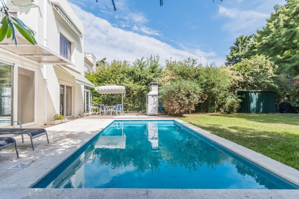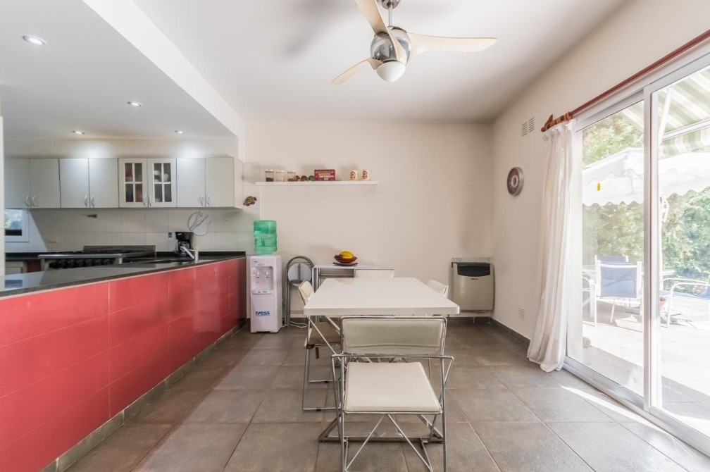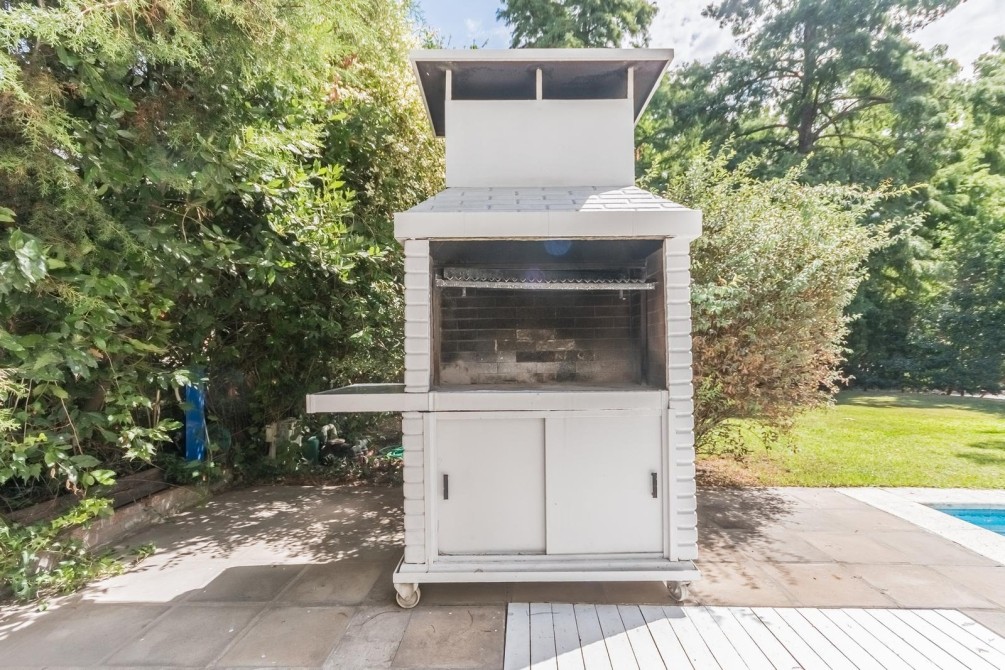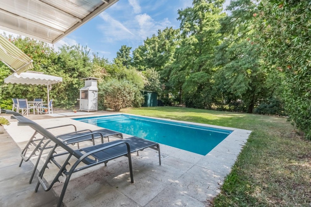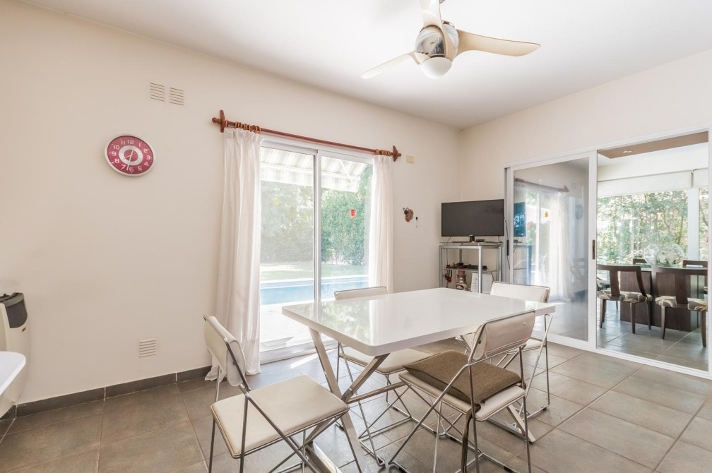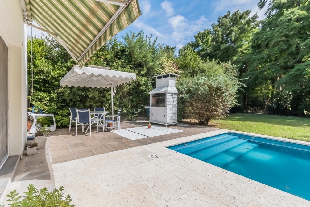 Por la cocina y por el living accedemos al gran y cuidado jardín con piscina, a la galería con toldo y al quincho semicubierto. También se accede a la cochera.
