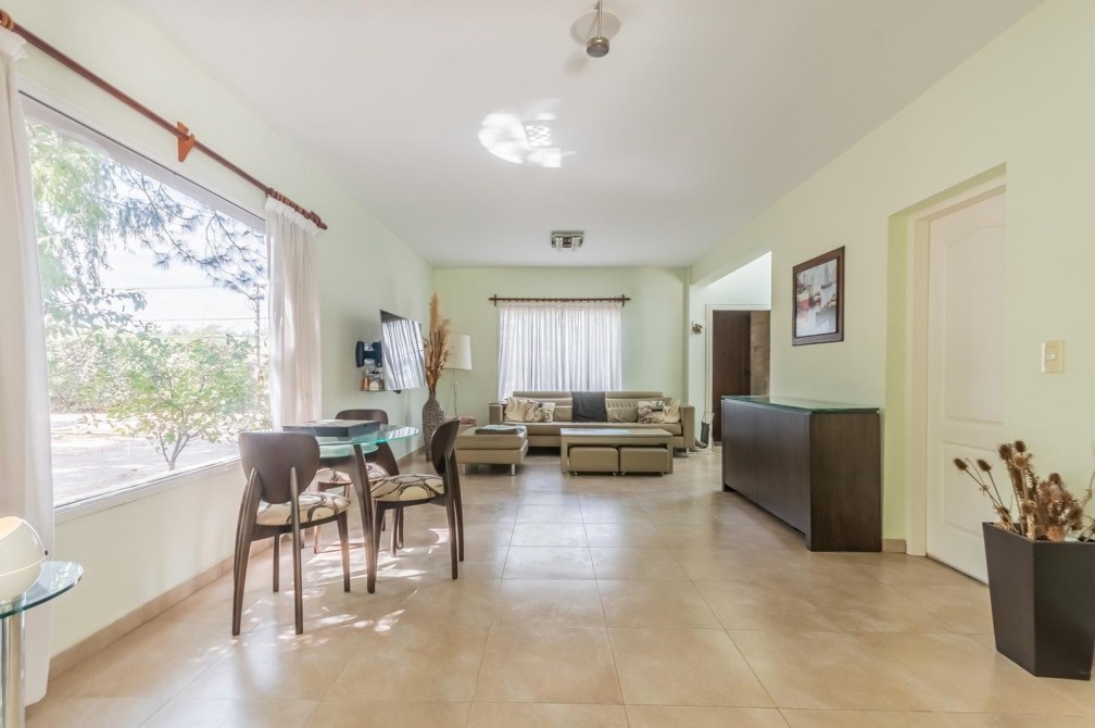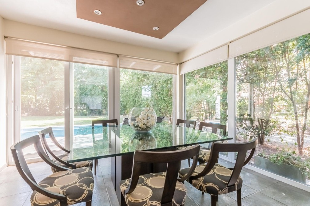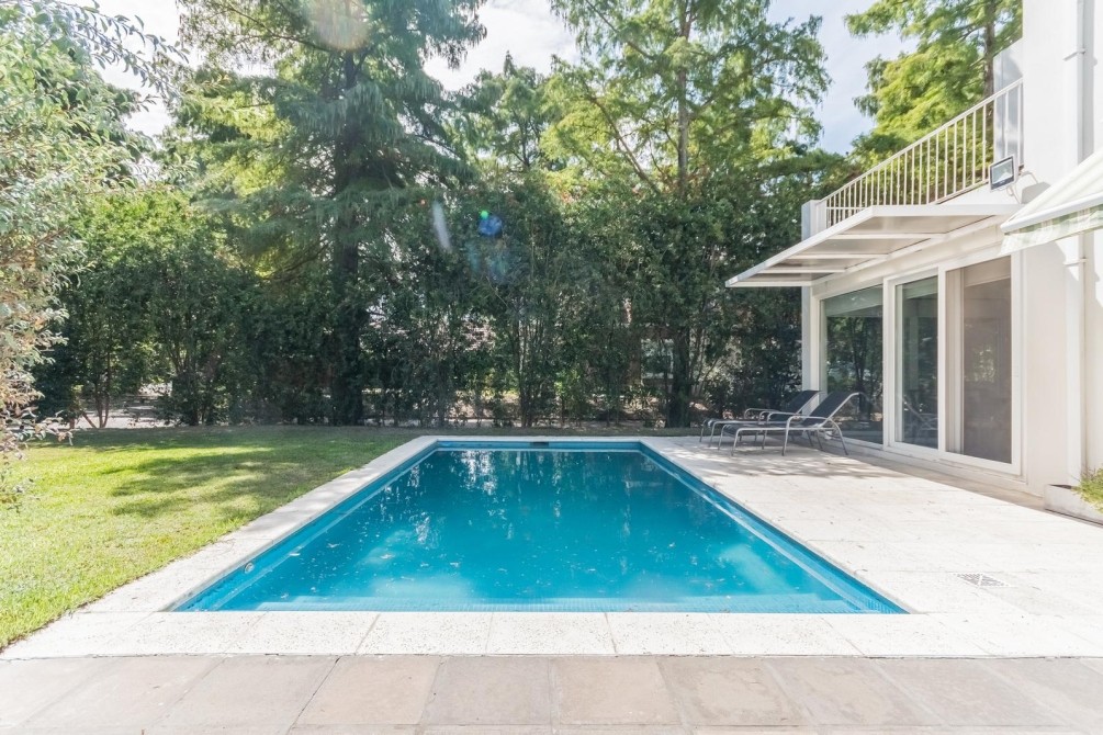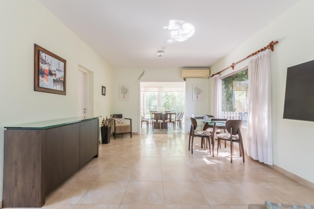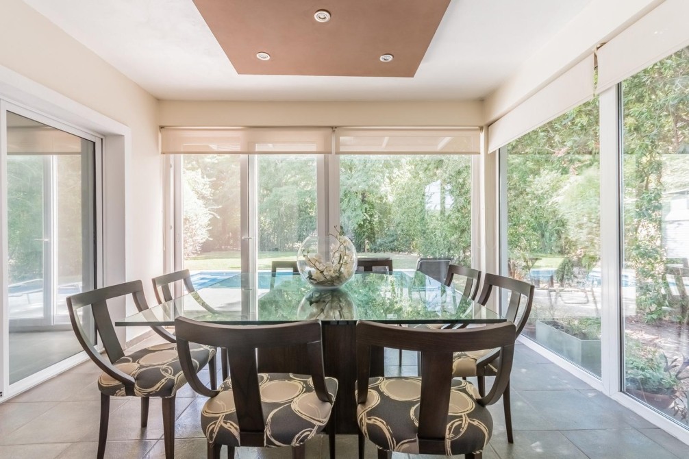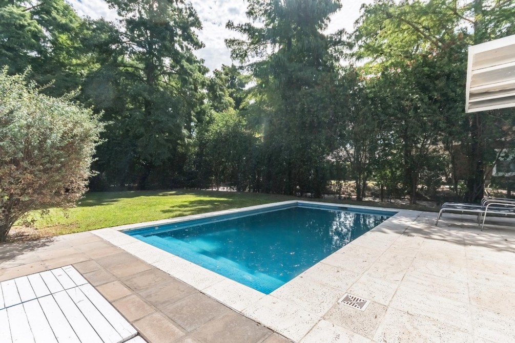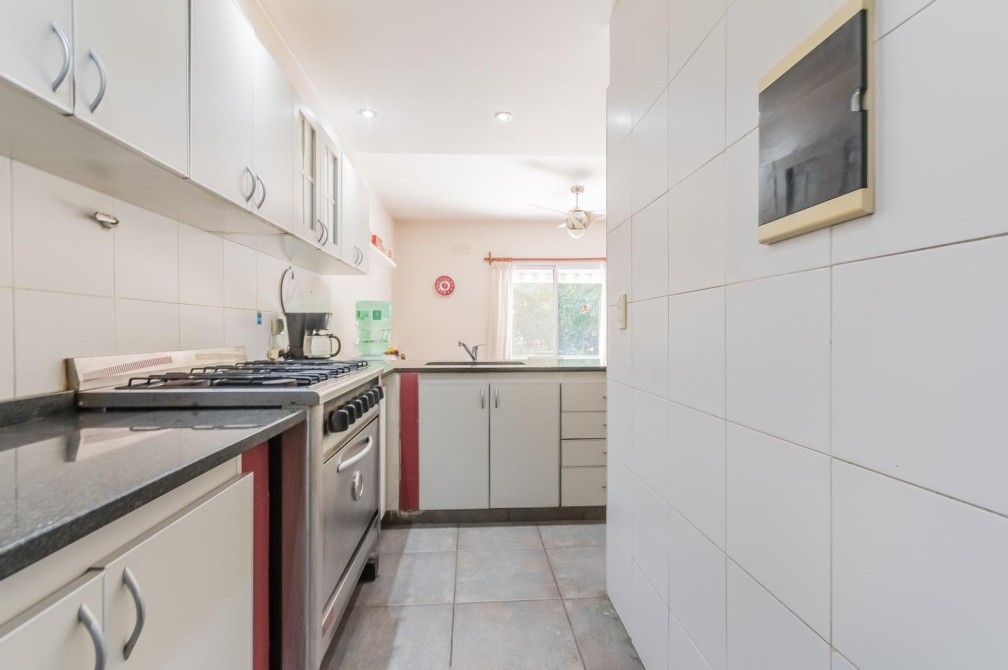 Por la cocina y por el living accedemos al gran y cuidado jardín con piscina, a la galería con toldo y al quincho semicubierto. También se accede a la cochera.