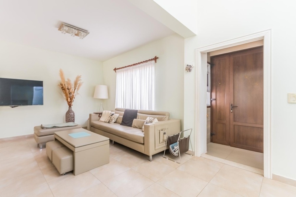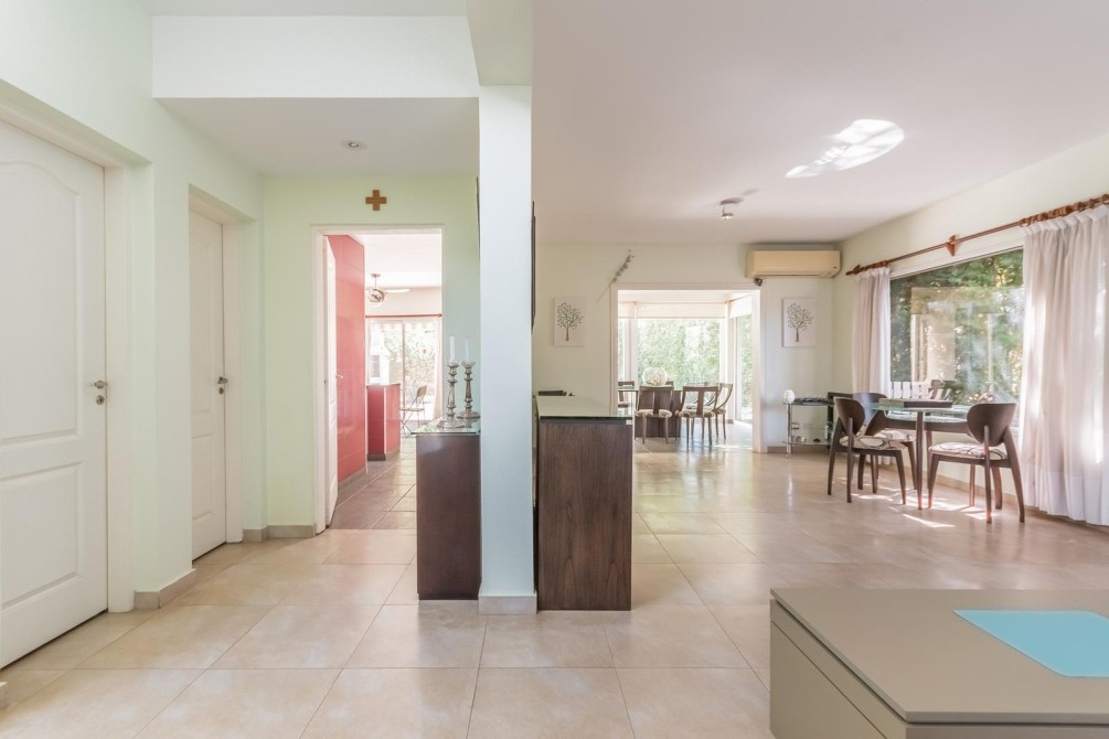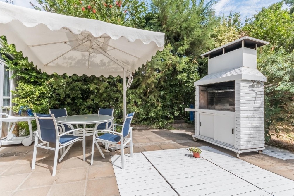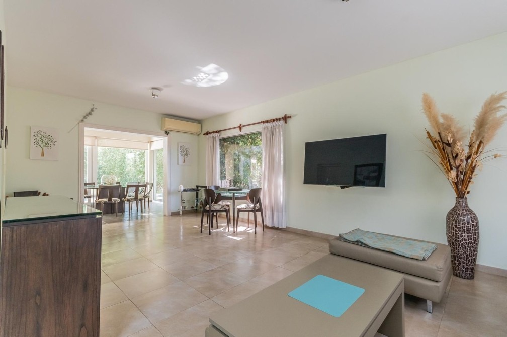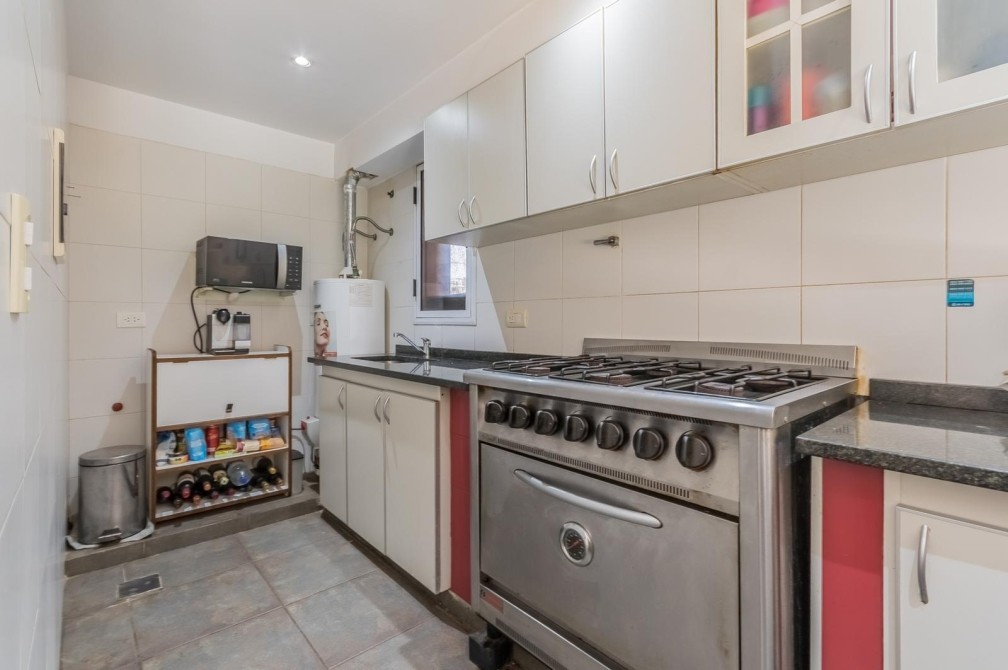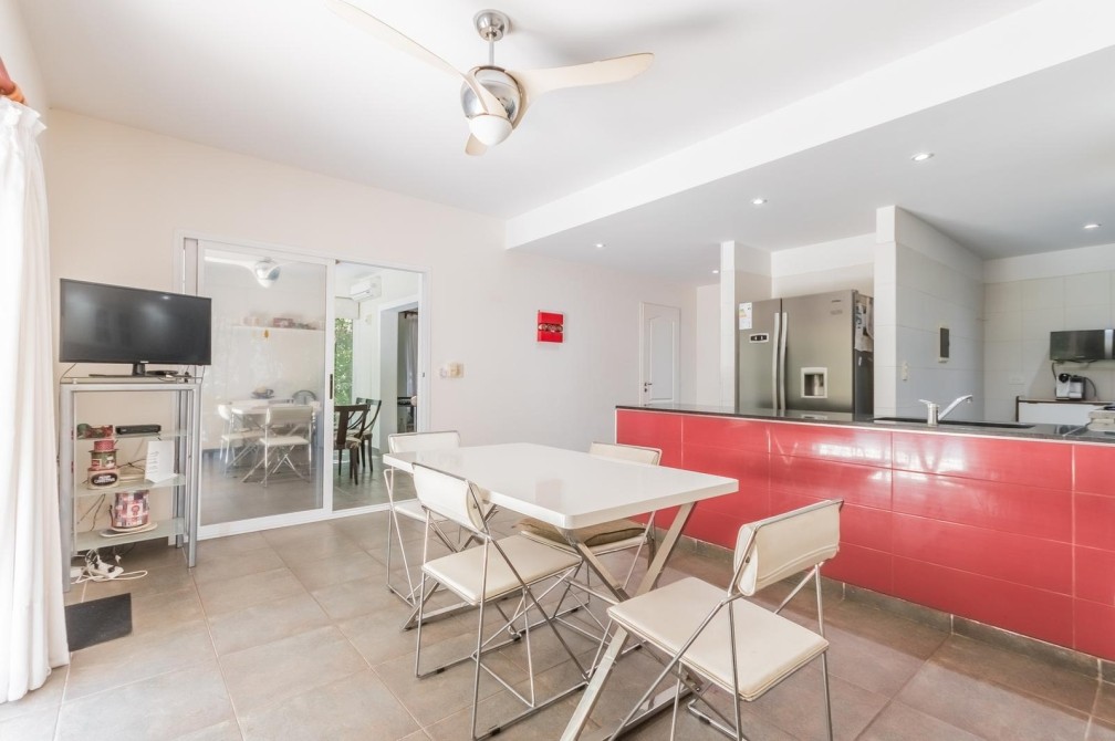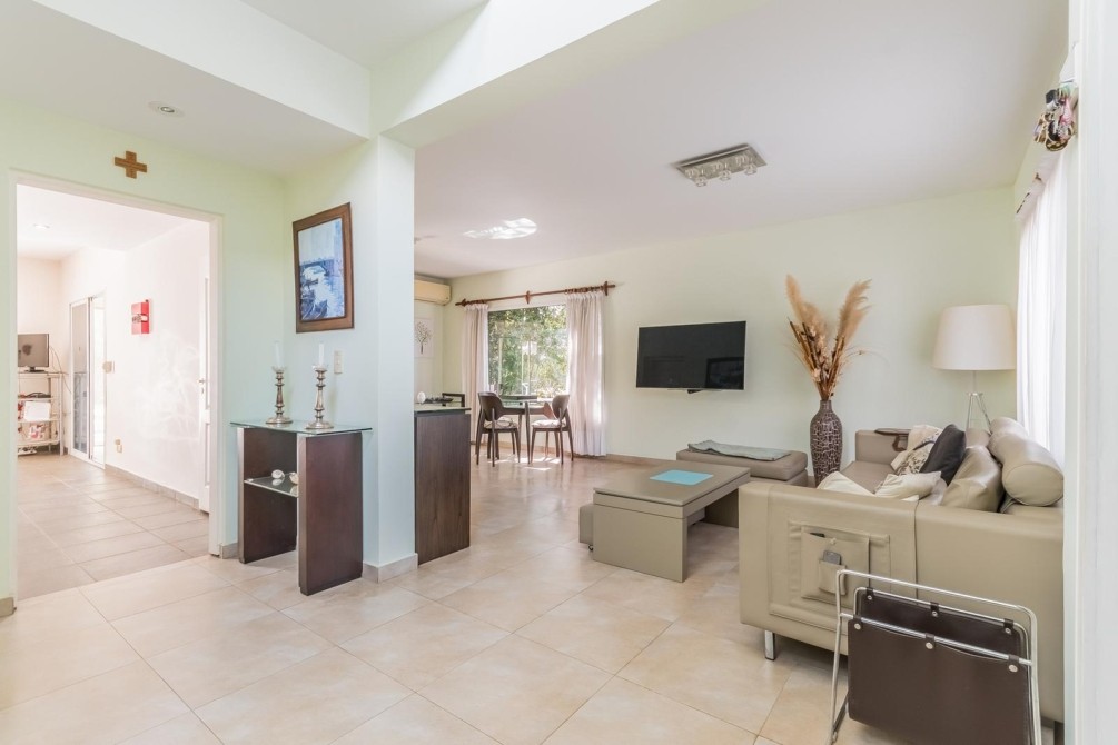 Por la cocina y por el living accedemos al gran y cuidado jardín con piscina, a la galería con toldo y al quincho semicubierto. También se accede a la cochera.