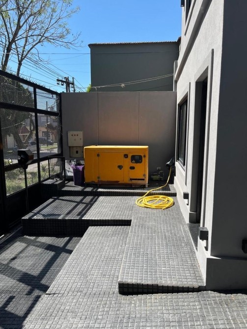 En planta baja se encuentra el living comedor al frente, baño completo, cochera pasante con portón levadizo para hasta 3 vehículos, cocina comedor espaciosa, sector de quincho integrado y amplio patio con césped sintético, ideal para actividades familiares y sociales. La propiedad cuenta con instalación trifásica y grupo electrógeno