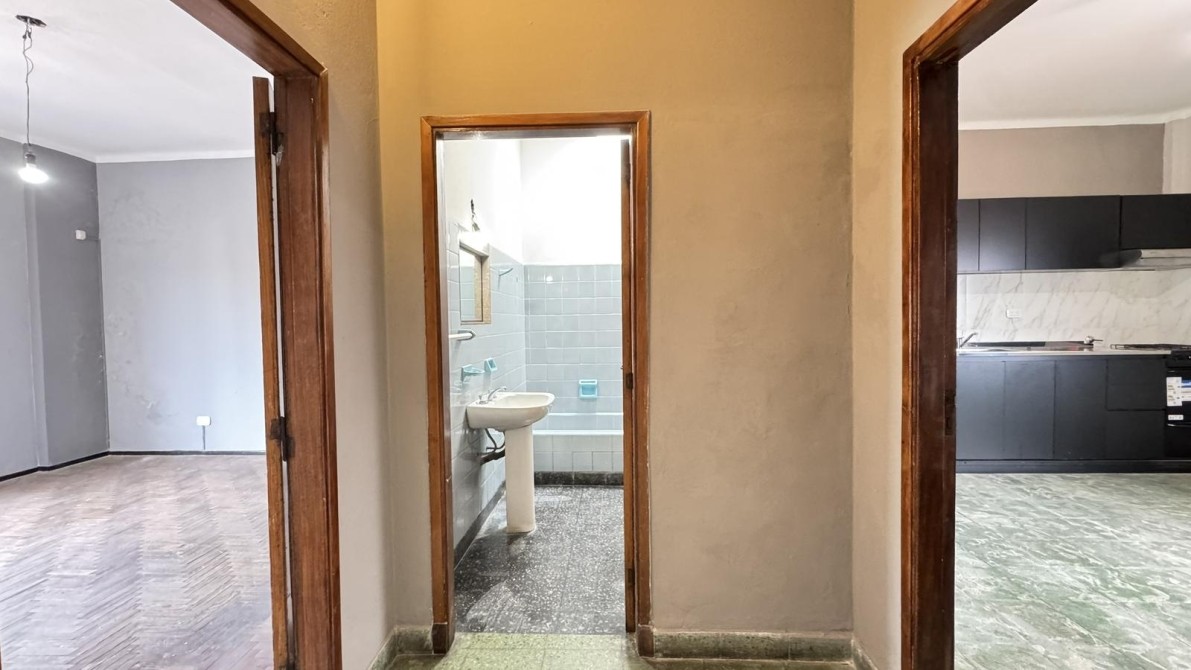 Cuenta con un amplio living comedor, 2 dormitorios con piso de parquet y balcón a la calle sobre todo el frente, hall distribuidor hacia baño completo, cocina comedor amplia con muebles bajo mesada y alacena nuevos y patio de 3 x 4 aprox. con un gran lavadero cubierto.