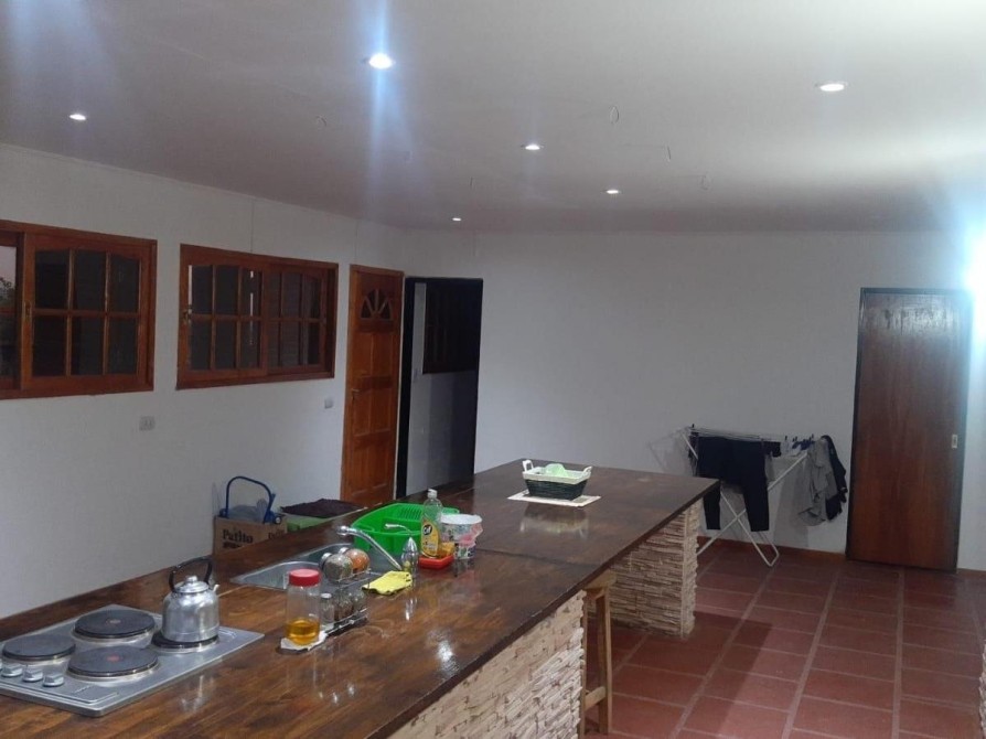 Cocina de 7 x 12m. con isla en el medio de 5 x 1.80m. de ancho, con anafe eléctrico de 4 hornallas, horno eléctrico, heladera y freezer.