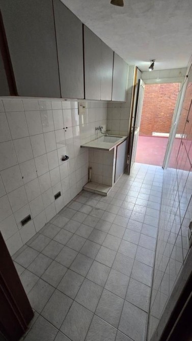 Lavadero de 1,50 m x 3,70 m con muebles colgantes y salida a patio de 3,90 m x 4,90 m con parrilla;