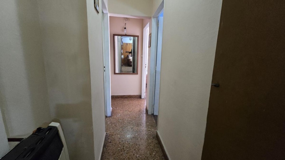 Living de entrada tipo recibidor de 2,60 m x 3 m con puerta acordeón unificado a Cocina-comedor diario en “L” de 4 m x 5,80 m y 2,60 m x 5,50m con bajo y sobre mesada, calefón, lavadero con conexión para lavarropas y hogar a gas;