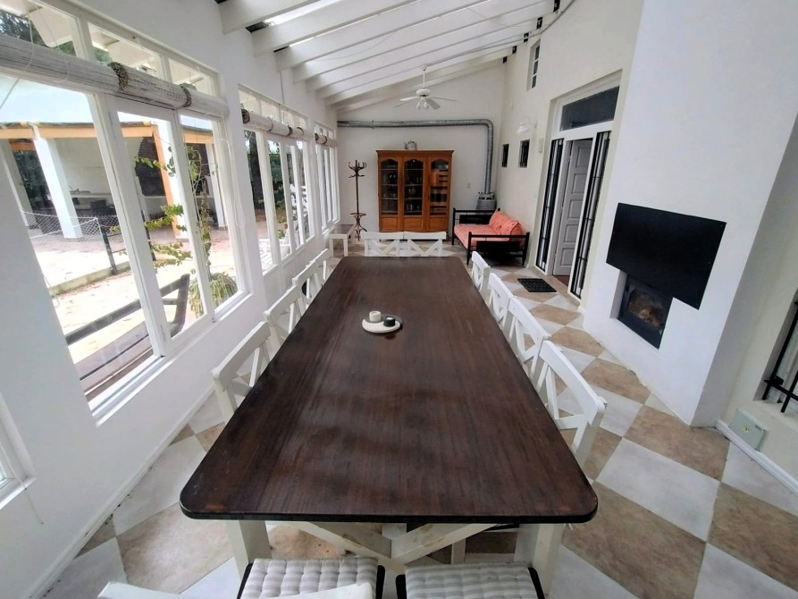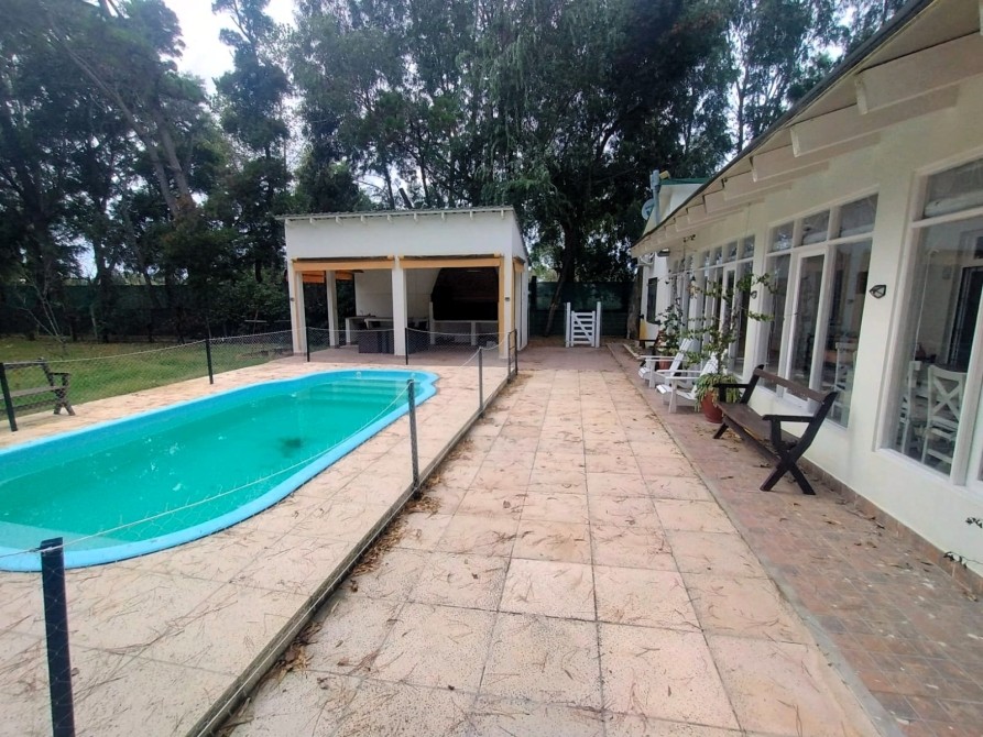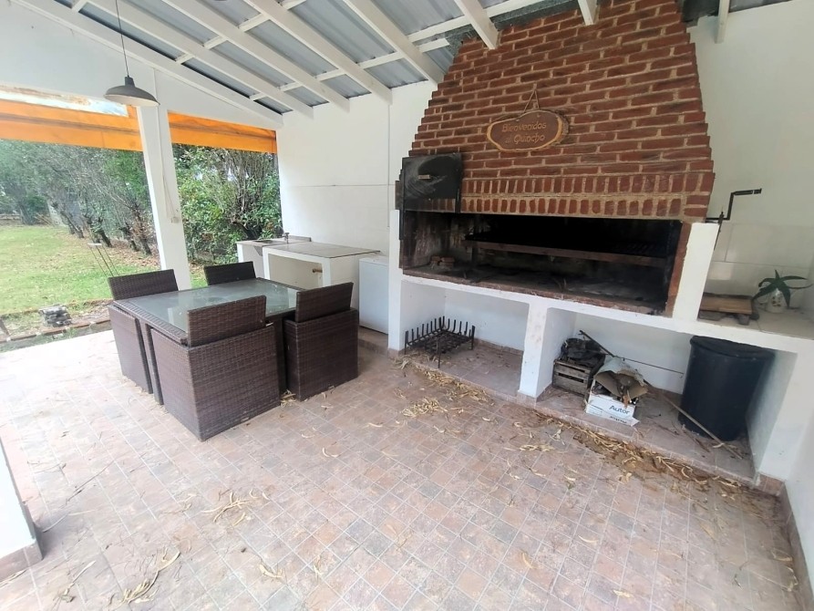 Quincho con parrilla, pileta y sector de árboles frutales.