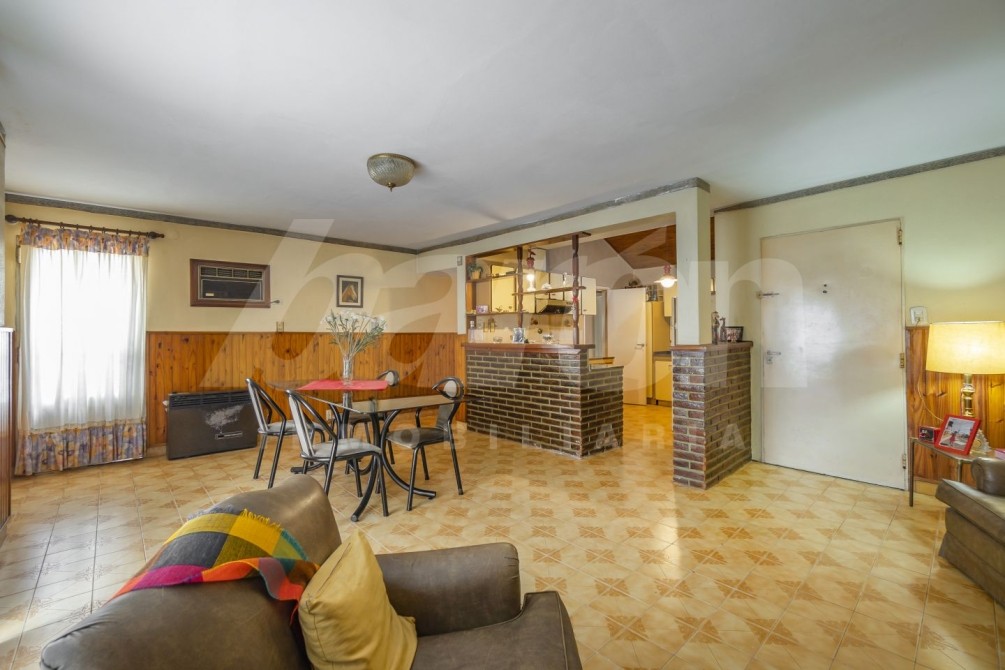 Al frente cuenta con un pequeño jardin. Al ingresar, se desarrolla un amplio living comedor en desnivel, que aporta categoría y personalidad al ambiente principal y calefaccionado mediante hogar a gas . A través de un pasillo distribuidor se accede a un baño completo con bañera y a un dormitorio en planta baja.