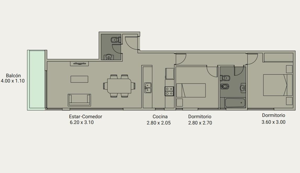 • 3 ambientes de 68 m2 totales, living comedor con cocina integrada, toilette, 2 dormitorios con placard, baño completo y balcón.