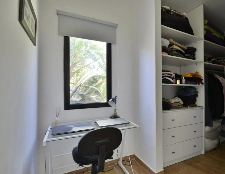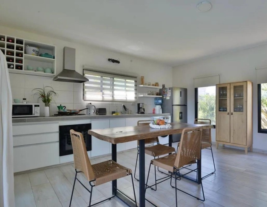 Con una superficie cubierta de 120 m², la vivienda cuenta con dos amplios dormitorios, incluyendo una suite principal situada en planta baja con vestidor y roperos con interiores. Los dos baños completos ofrecen un diseño elegante y funcional. La cocina integrada está equipada con horno eléctrico, anafe, bajo mesada y campana, proporcionando un espacio ideal para los amantes de la gastronomía.