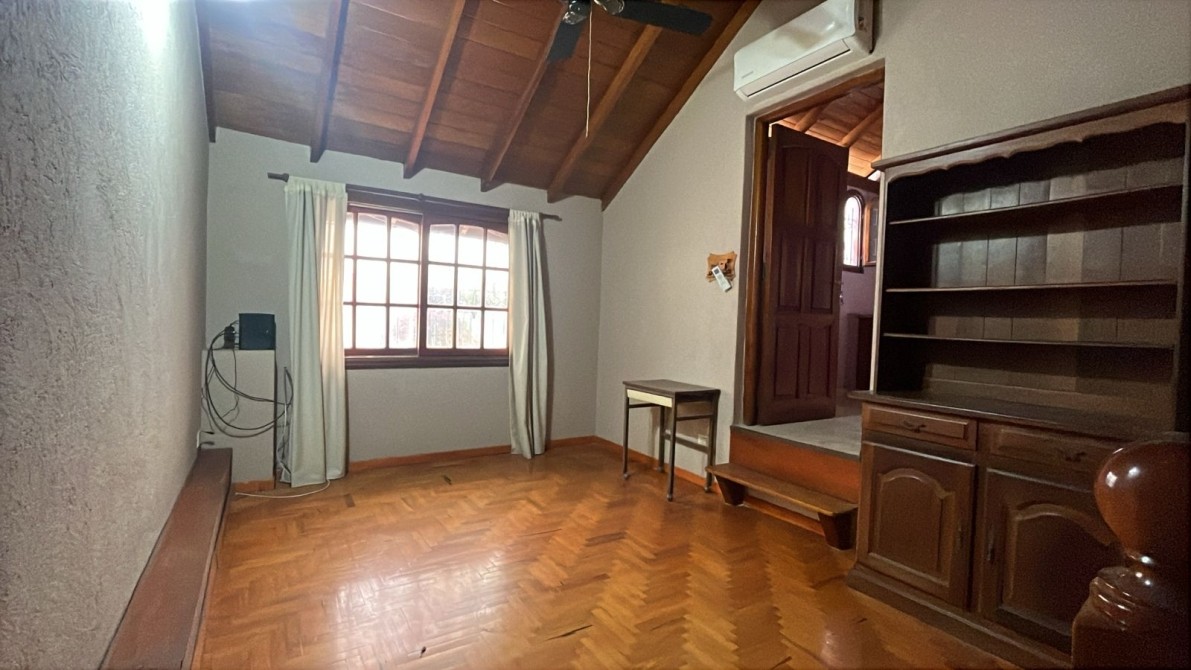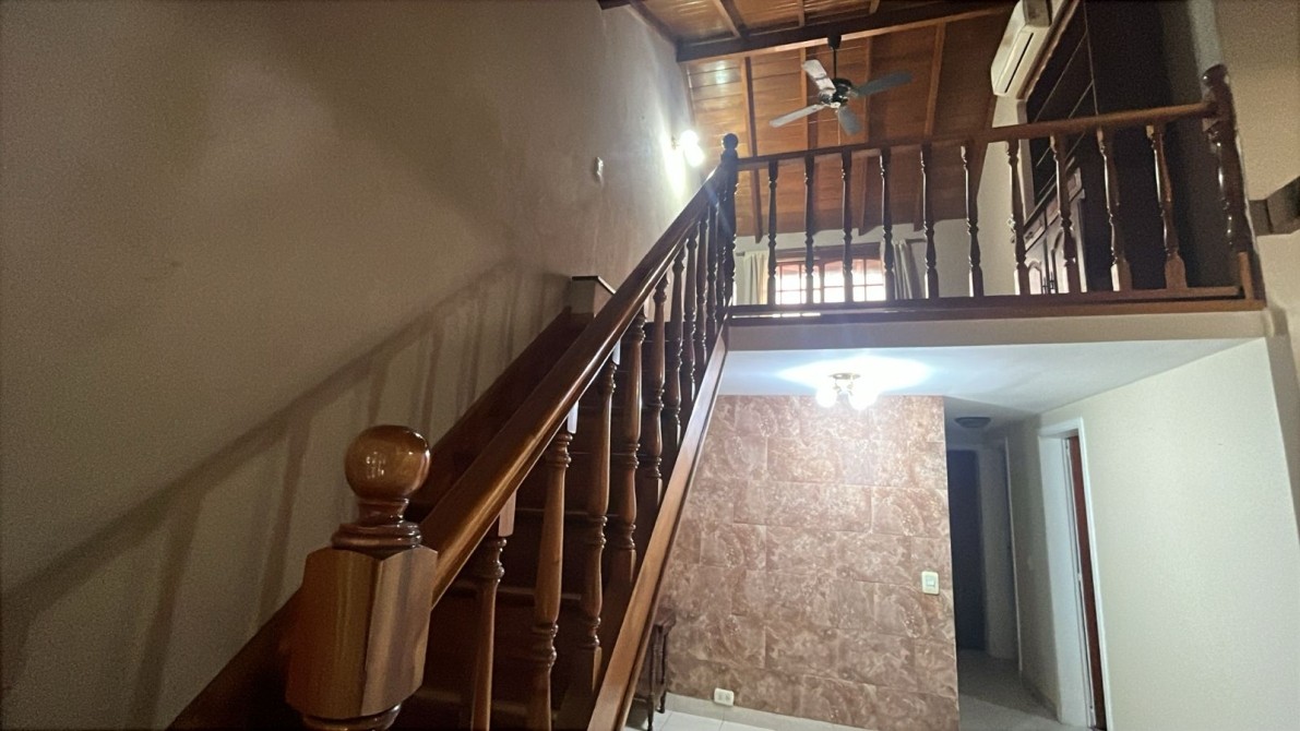 Hermosa Chalet, con detalles de categoria, Living comedor muy amplio, escalera a entrepiso de madera que balconea al living (varios destinos), lavadero cubierto en planta alta con salida a la terraza, dos dormitorios con placard y aire acondicionado, cocina comedor muy bien instalada, garage para dos vehiculos con porton levadizo motorizado, parrilla con mesada, fondo libre. El inmueble posee cisterna y estabilizador de tension.-  Locacion mas servicios y tsg.-