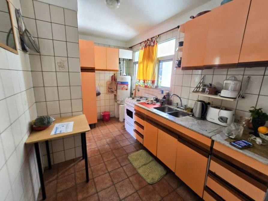 Cocina amplia con muebles bajo mesada y alacenas laminadas, sector termotanque con espacio lavarropas.