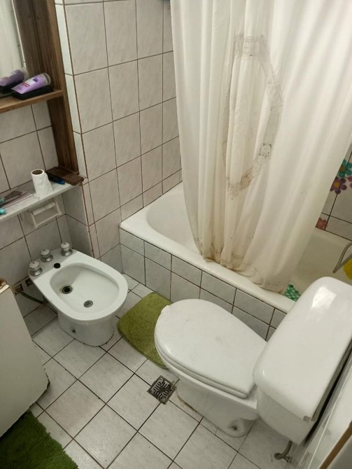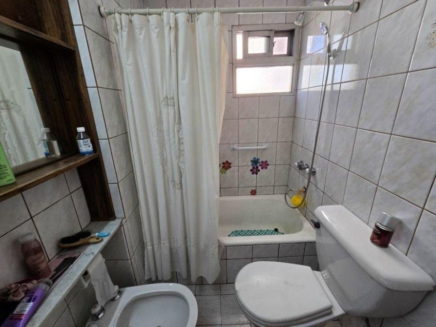 Baño instalado completo con bañera y vanitory, pisos y revestimientos cerámicos con ventilación e iluminación natural.