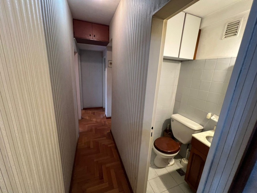 La unidad cuenta con toilette o baño de servicio, baño principal completo y tres dormitorios con placard. Dos de ellos poseen vista al frente, mientras que el restante ofrece una interesante visual abierta hacia el Río de la Plata.