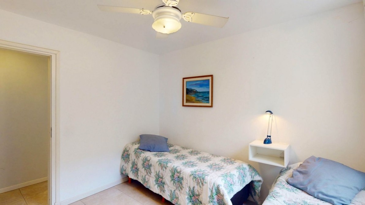 - Dormitorio con dos camas individuales con ventilador de techo.