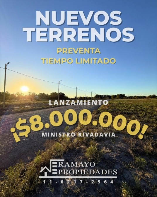 VENTA – RAMAYO PROPIEDADES – LANZAMIENTO TERRENOS ESCRITURABLES en Ministro Rivadavia