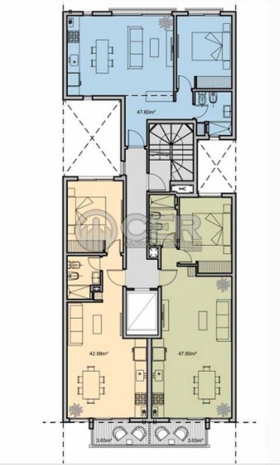 La propuesta arquitectónica cuenta con 9 pisos de viviendas con 3 departamentos de 2  ambientes por piso, planta baja con acceso a cocheras y terraza de uso común.
