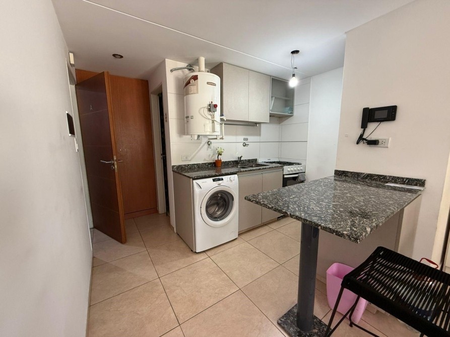 Cuenta con: Ambiente amplio y funcional, Cocina integrada con muebles completos y barra desayunadora, Baño completo, Balcón al frente