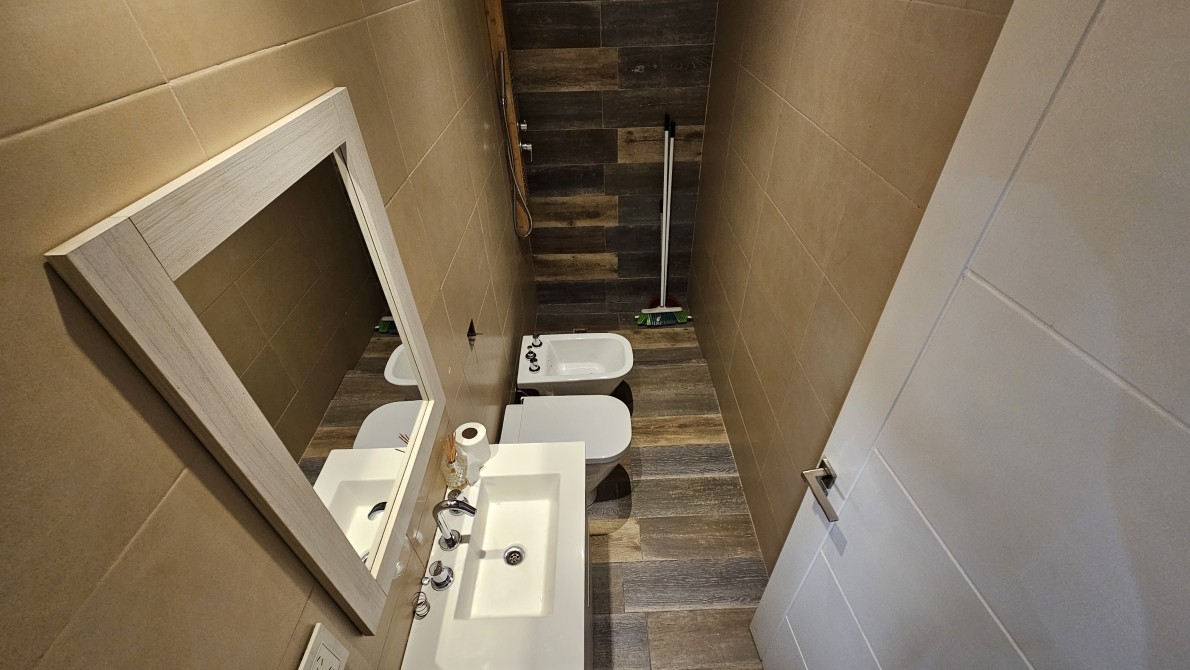 El baño es amplio, algo poco habitual en este tipo de unidades, con ducha, inodoro, bidet y lavamanos.