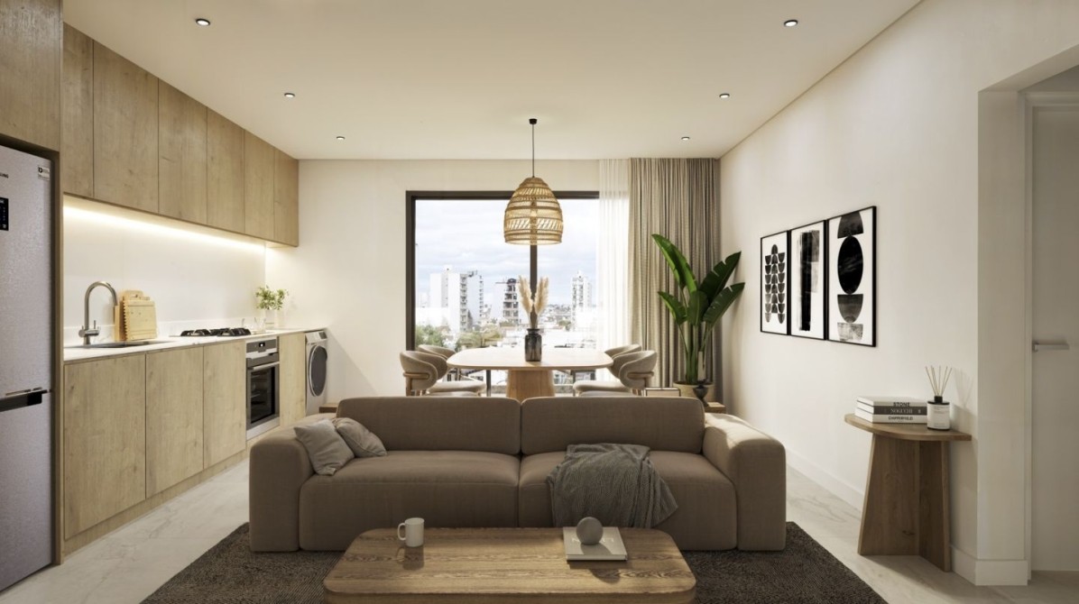 El ingreso a la unidad se realiza a través de una puerta de triple seguridad, accediendo a un amplio y luminoso living-comedor con salida al balcón. La cocina se presenta integrada y estará equipada con muebles bajo y sobre mesada, mesada de cuarzo, artefacto de cocina a gas y preinstalación para lavarropas.