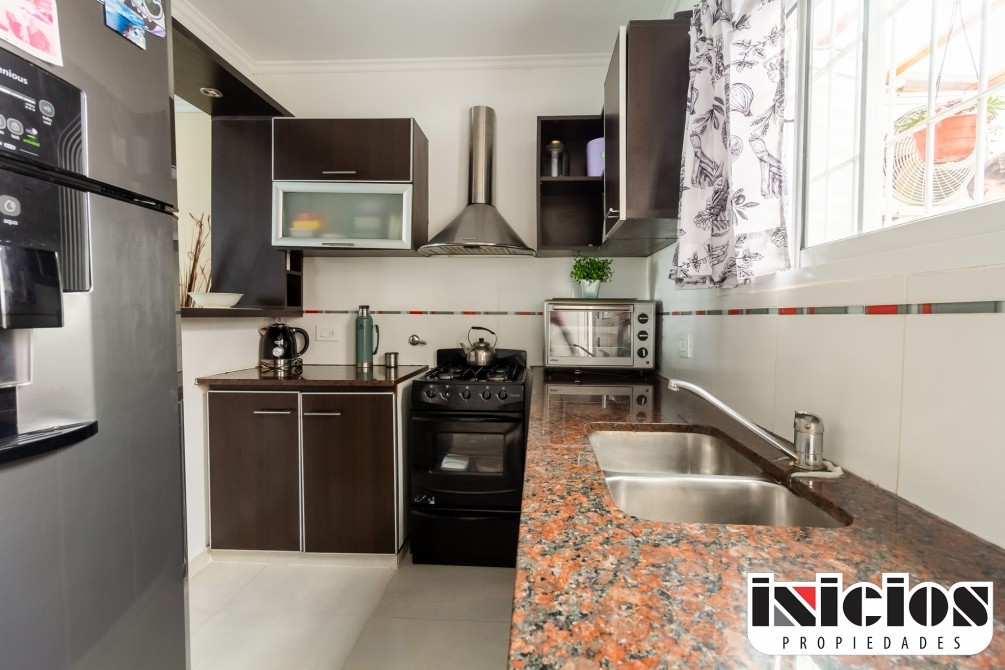 La cocina, completamente equipada, cuenta con un práctico desayunador que aporta calidez y comodidad.