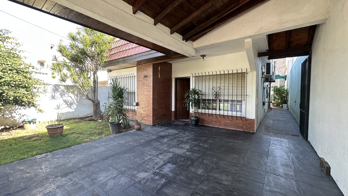 Garage cubierto al frente, pequeño jardín y pasillo lateral con acceso directo al fondo sin ingresar a la vivienda.
