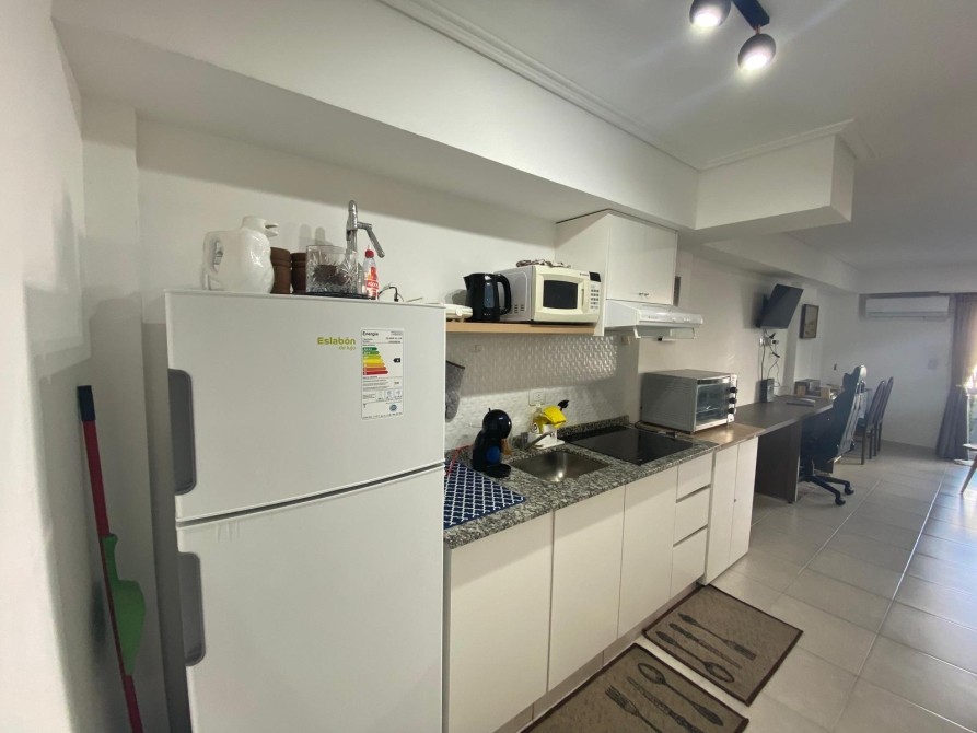 - Al ingresar nos encontramos con la cocina con bajo mesada y alacenas, heladera, anafe eléctrico de 4 hornallas, horno eléctrico y microondas.