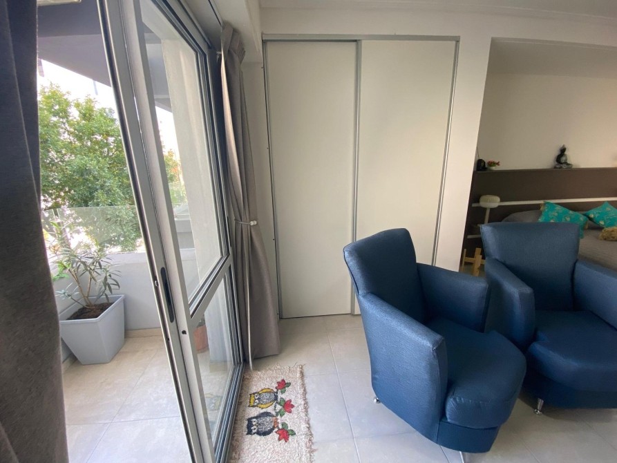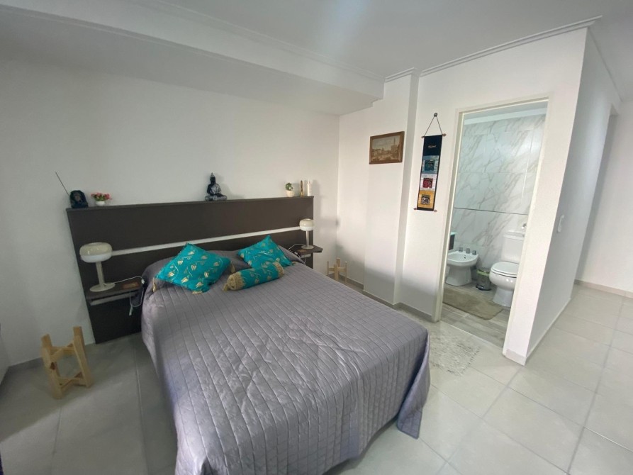 - En el ambiente encontramos el sector dormitorio donde se encuentra la cama de 2 plazas, con sus mesas de luz, placard con espacio de guardado de dos puertas.