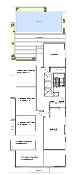 Desde el ingreso, el edificio transmite categoría y presencia, con un hall de doble altura que marca el carácter del proyecto y anticipa el nivel de detalle con el que fue concebido. Cada espacio común fue pensado para disfrutar, relajarse y compartir: en la azotea, la piscina y el solarium invitan a bajar el ritmo y disfrutar del aire libre; el gimnasio suma practicidad a la rutina diaria; y el SUM con parrilla ofrece un lugar ideal para encuentros sociales en un entorno cuidado y de excelente calidad.