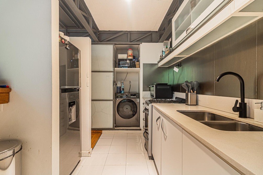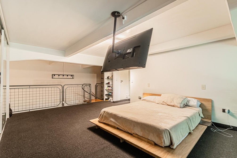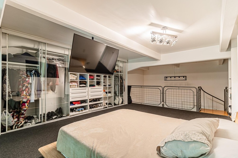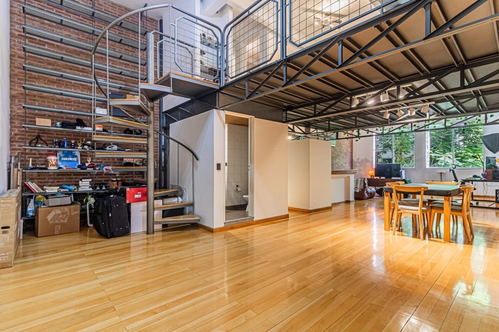 La escalera caracol lleva a la planta alta, donde una biblioteca se integra a la doble altura con vista al living. Dormitorio en suite con baño completo y gran placard tipo vestidor. Volumen, luz y carácter industrial genuino.