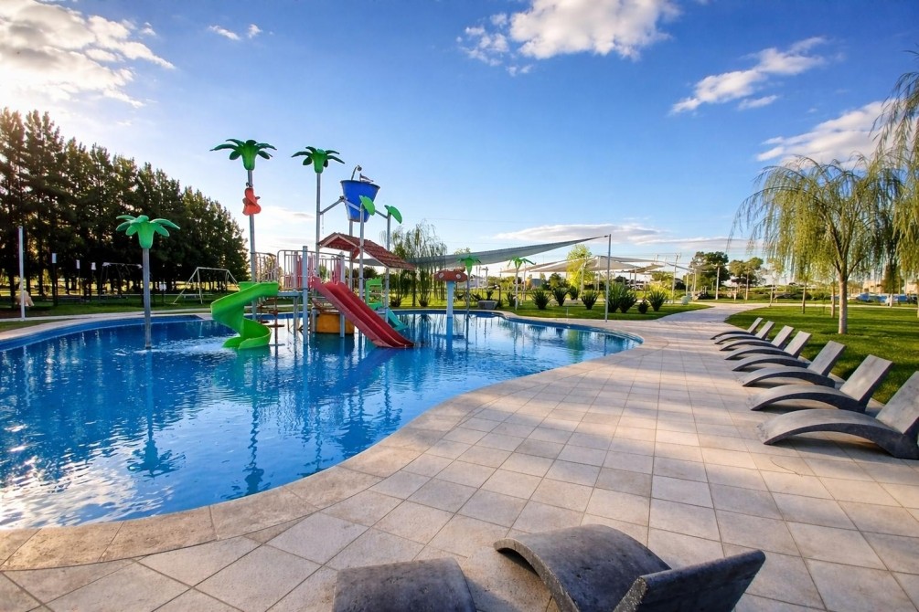 * 2 zonas deportivas: Fútbol, tenis, paddle, polideportivo, parque acuático, beach voley, skate park.
