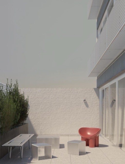 El revestimiento exterior llevará una combinación de hormigón visto con revoque texturado de micropiedras, un cerramiento en herreriana galvanizada para minimizar el mantenimiento.