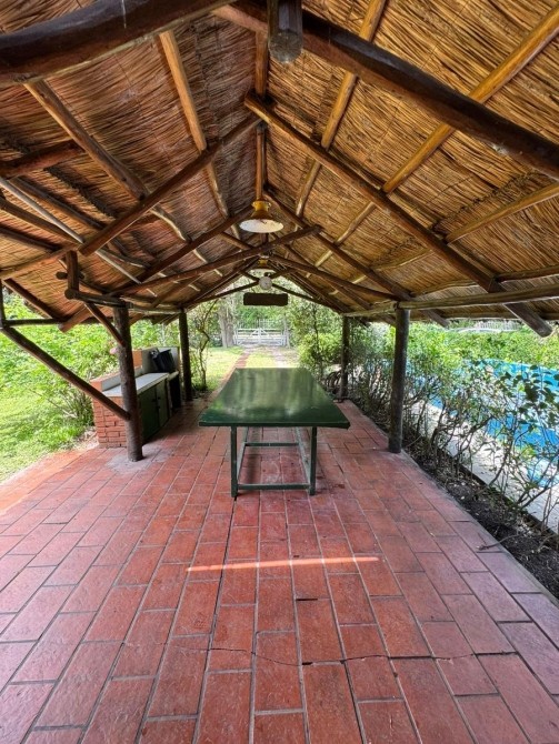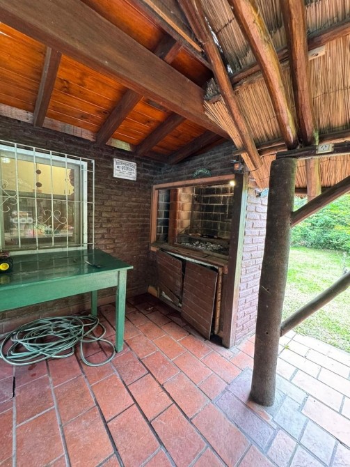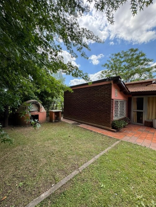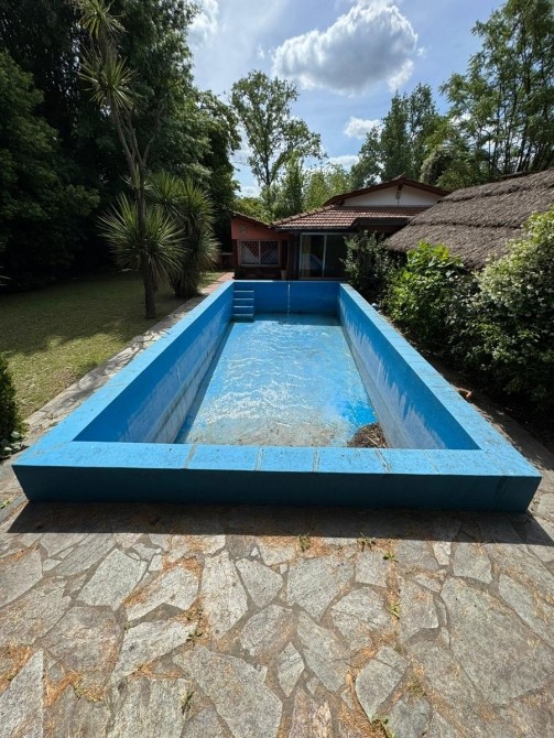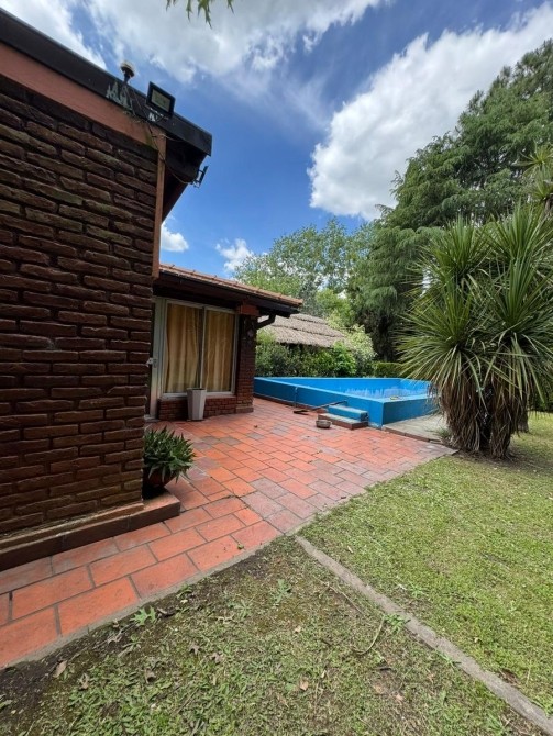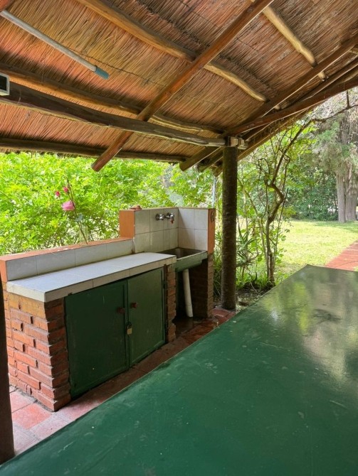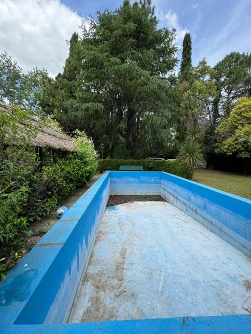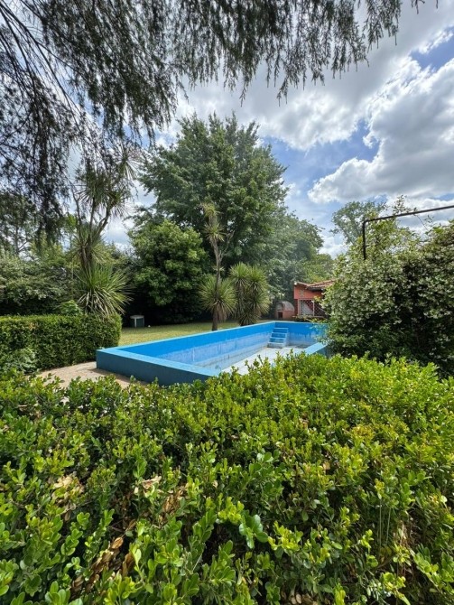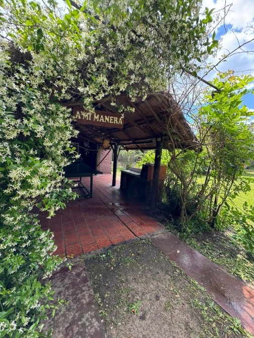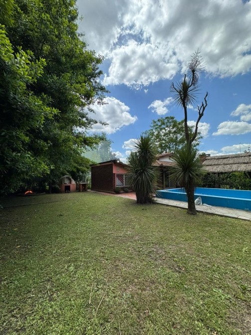Quincho con techo de paja, bachay mesada. Amplia piscina de material en jardín parquizado. Horno de barro.