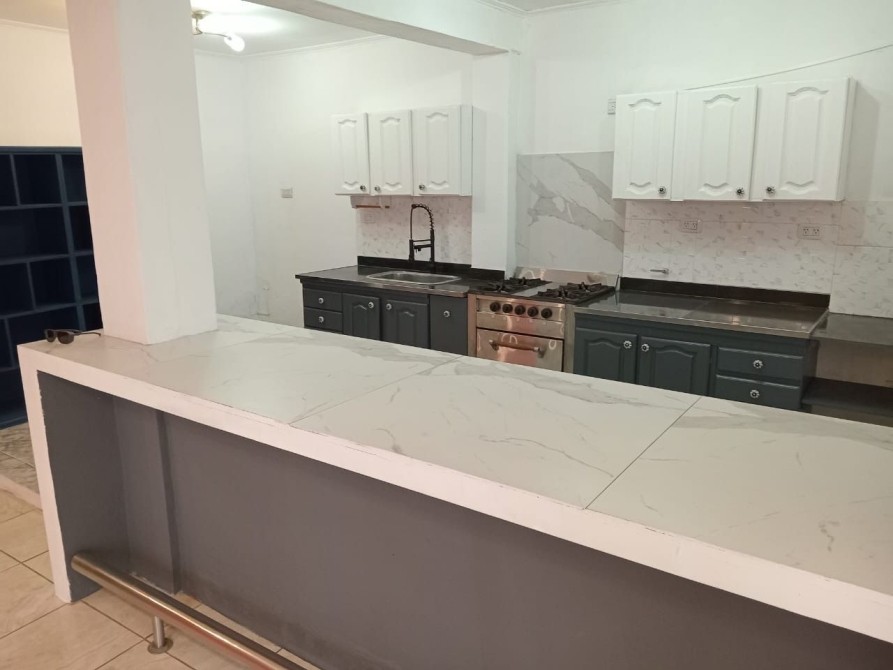 -Cocina semi-integrada equipada con muebles de bajo mesada, alacenas, artefacto de cocina y barra desayunadora.